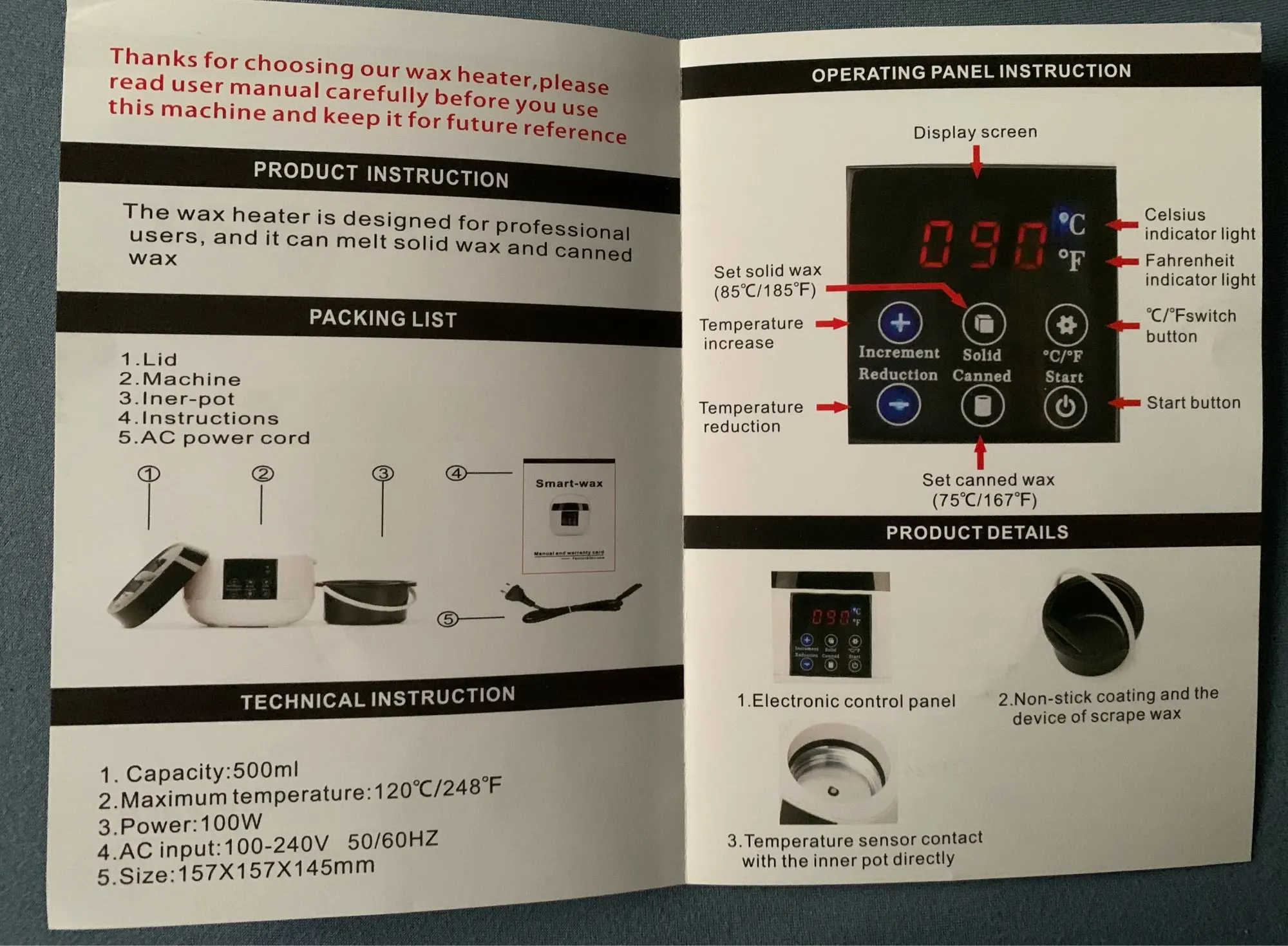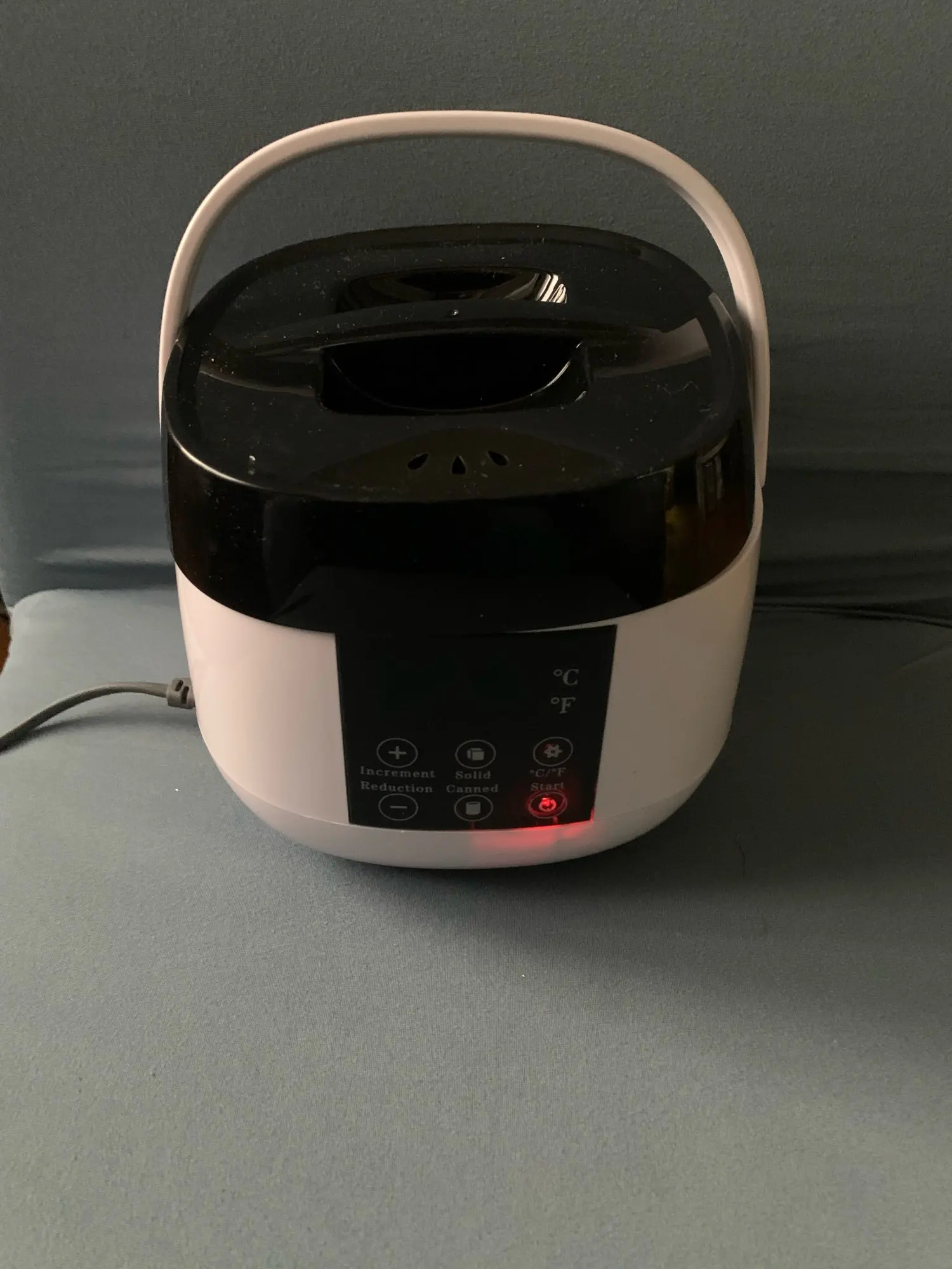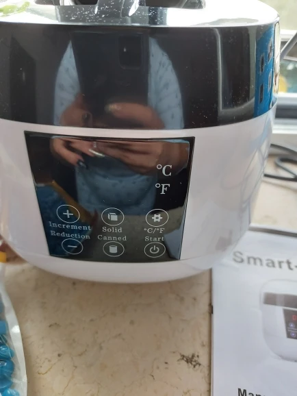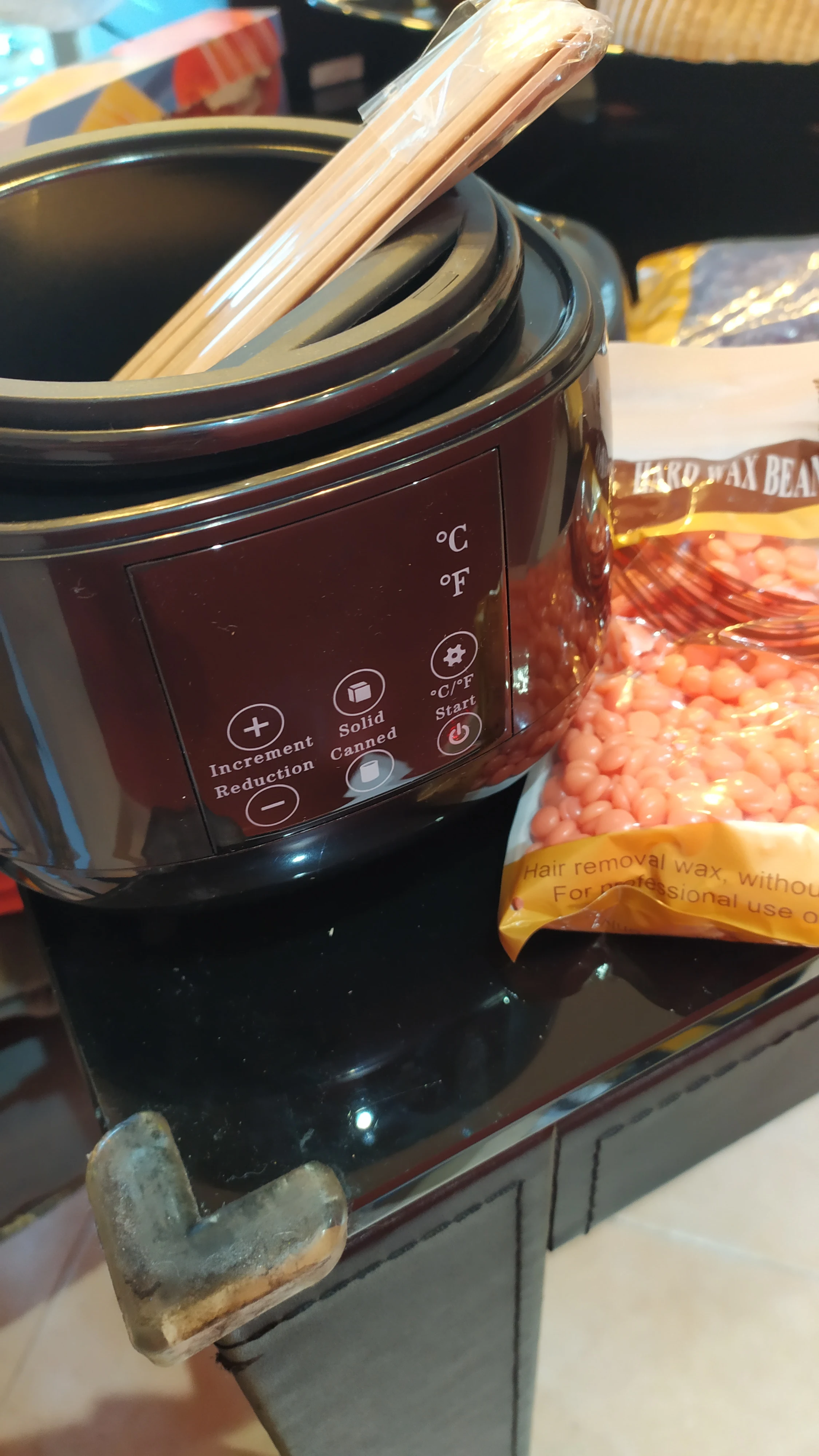 Очень отличный Мини-нагреватель воска. После включения вы можете установить степень, которую вы хотите, максимум до 120 • C, регулируемый 1 в 1, Тип градусов чтения, а также он имеет предварительный набор, на вид воска, который должен раствориться (твердый воск или консервированный воск). Если вы поворачиваете внутреннюю часть, пока духовка достигает температуры, это сигнал (1bip). Сверху она имеет удобную ручку бесплатно, единственный дефект, это черная крышка, которая просто наклоняется по всей конструкции. (Заказал 24,11.2020 и прибыл 9,12.2020)