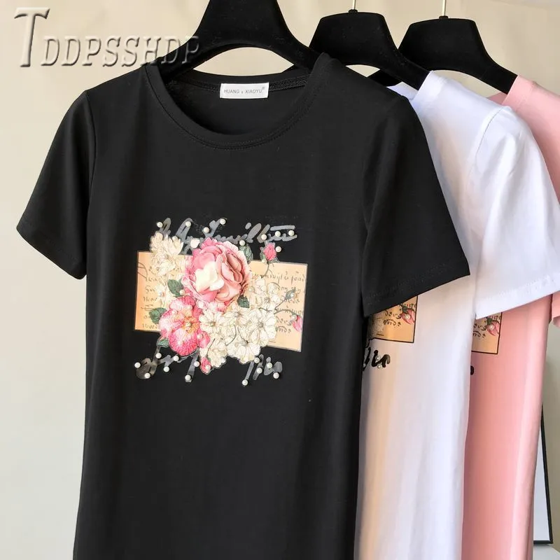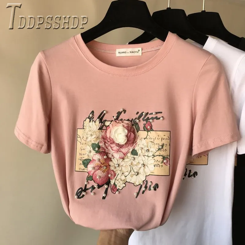 Женская летняя футболка с коротким рукавом, с цветочным принтом, украшенная бисером, 2020
