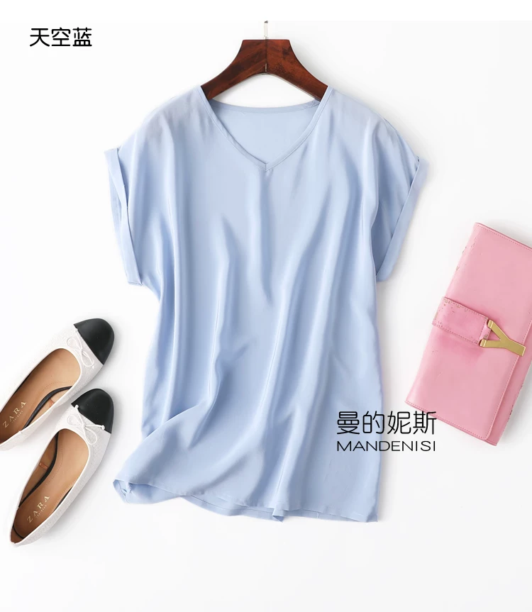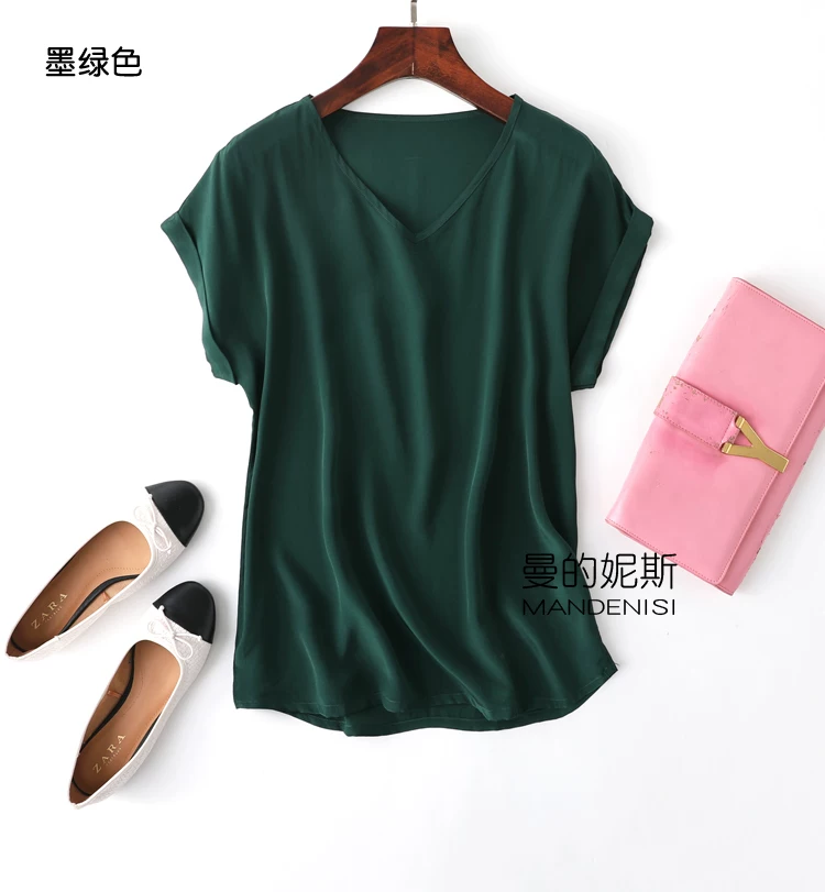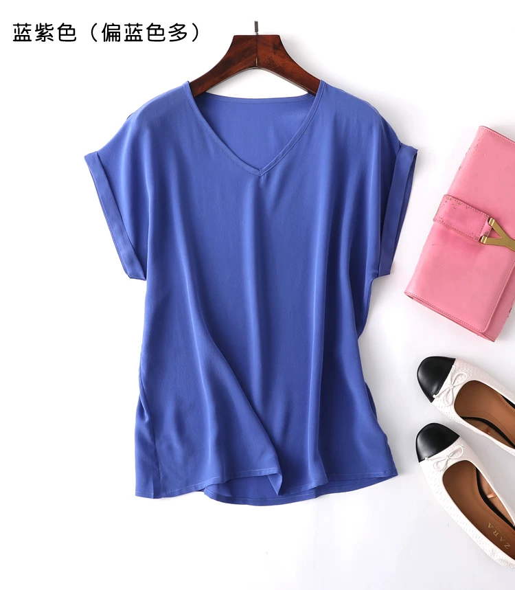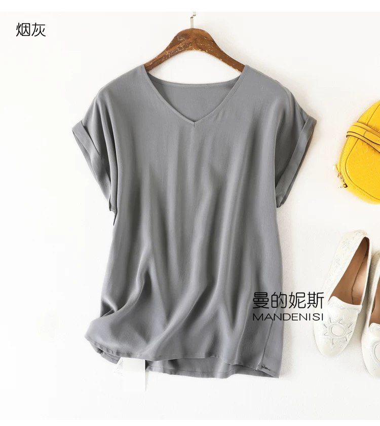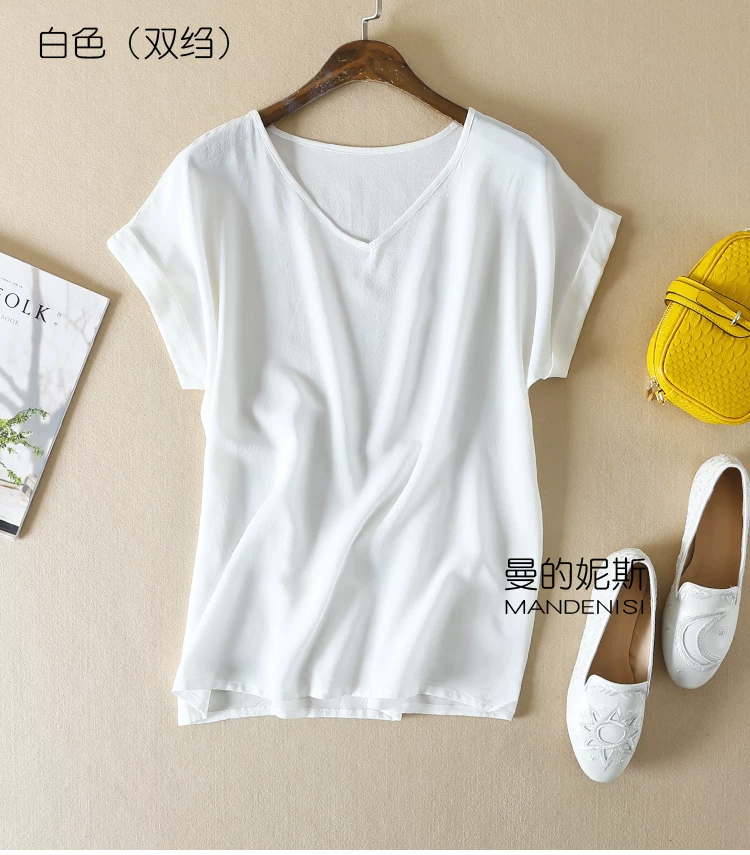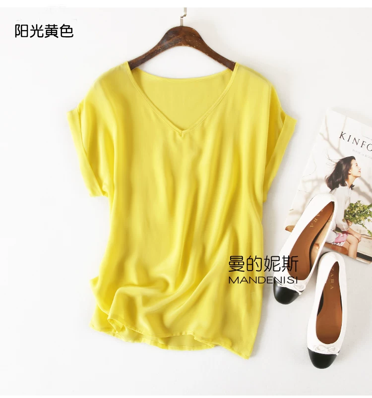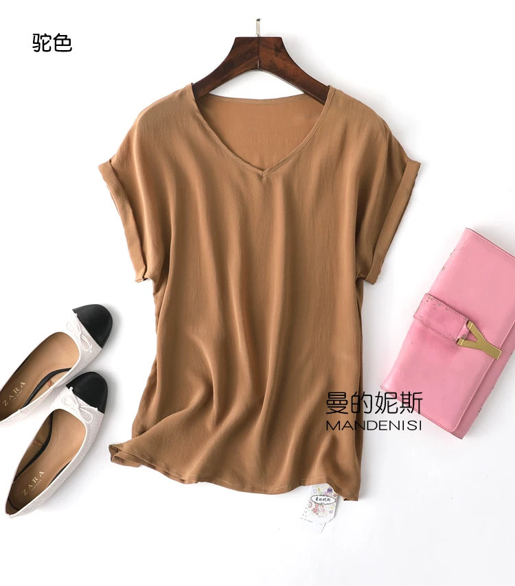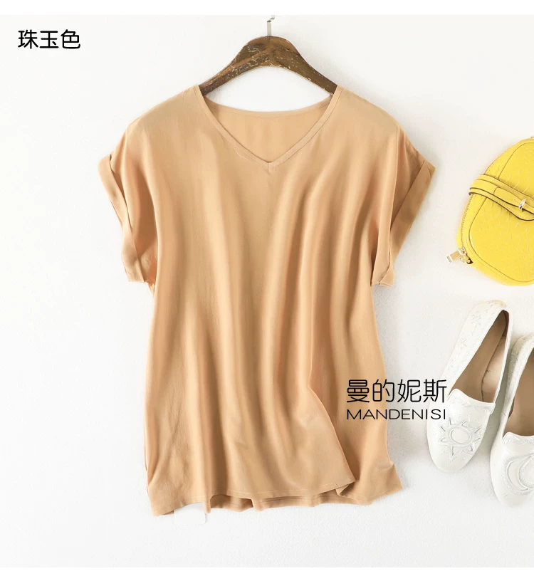 Летняя Однотонная рубашка с V-образным вырезом и короткими рукавами из 100% натурального шелка, женская одежда, размера плюс
