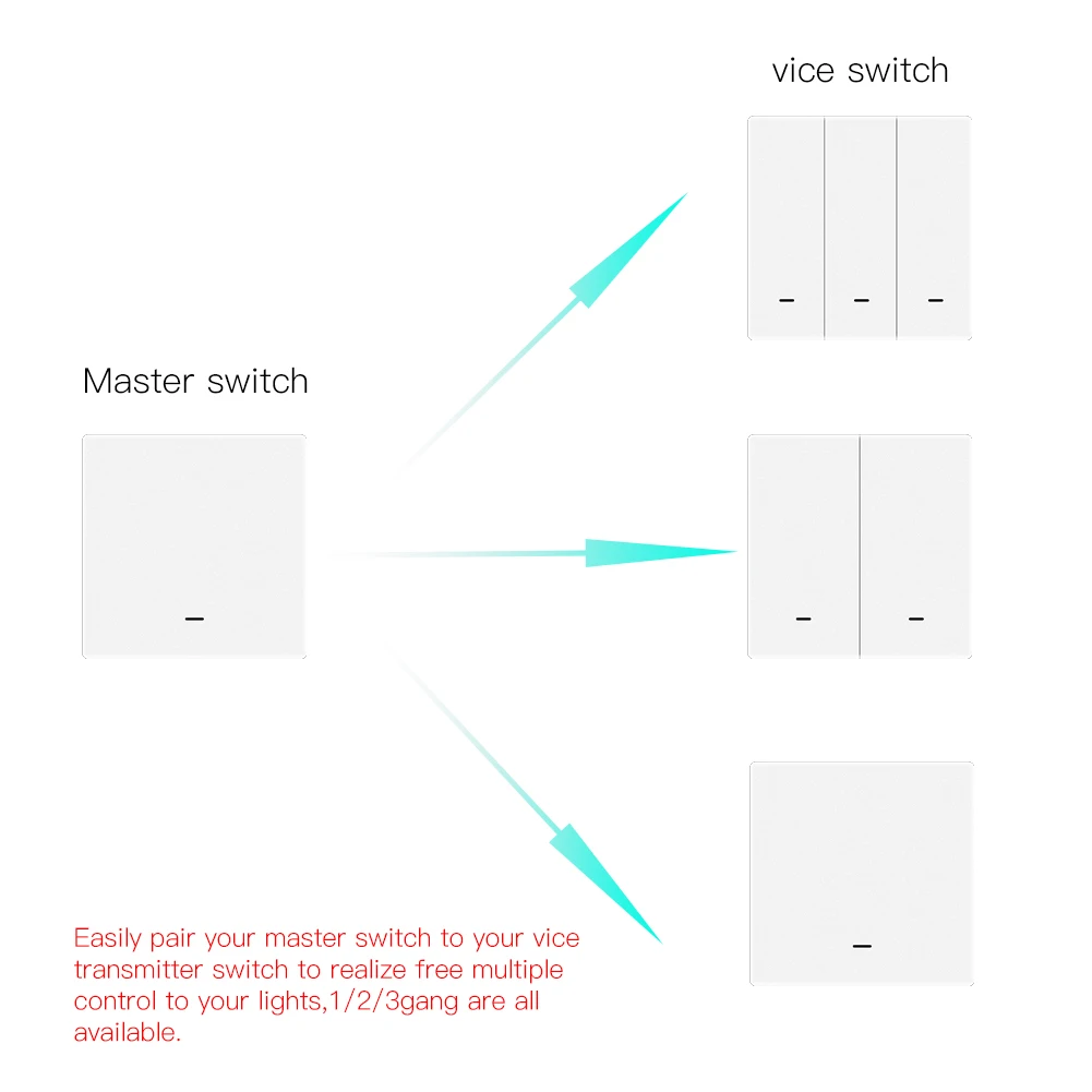 1. Вопрос: Что насчет старых, которые просто не знают, как использовать приложение для управления? О: для старых, а также для маленьких детей, настенный панельный передатчик с таким же видом, как и переключатель, является необязательным для них, чтобы легко управлять вашим переключателем. Просто подключите переключатель к передатчику панели стены.