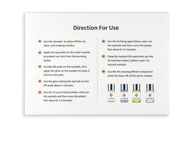 1. Силиконовый стержень: 5 пар (S,M,M1,M2,L)2. 2 пучка y-образных кисти для завивки: 3 шт. 3. Очищающее средство: 1 бутылка4. Перминг агент: 1 бутылка5. Фиксатор: 1 бутылка6. Увлажняющее средство: 1 бутылка7. Перминг Клей: 1 бутылка8. 5 мл/бутылка ложный клей для ресниц