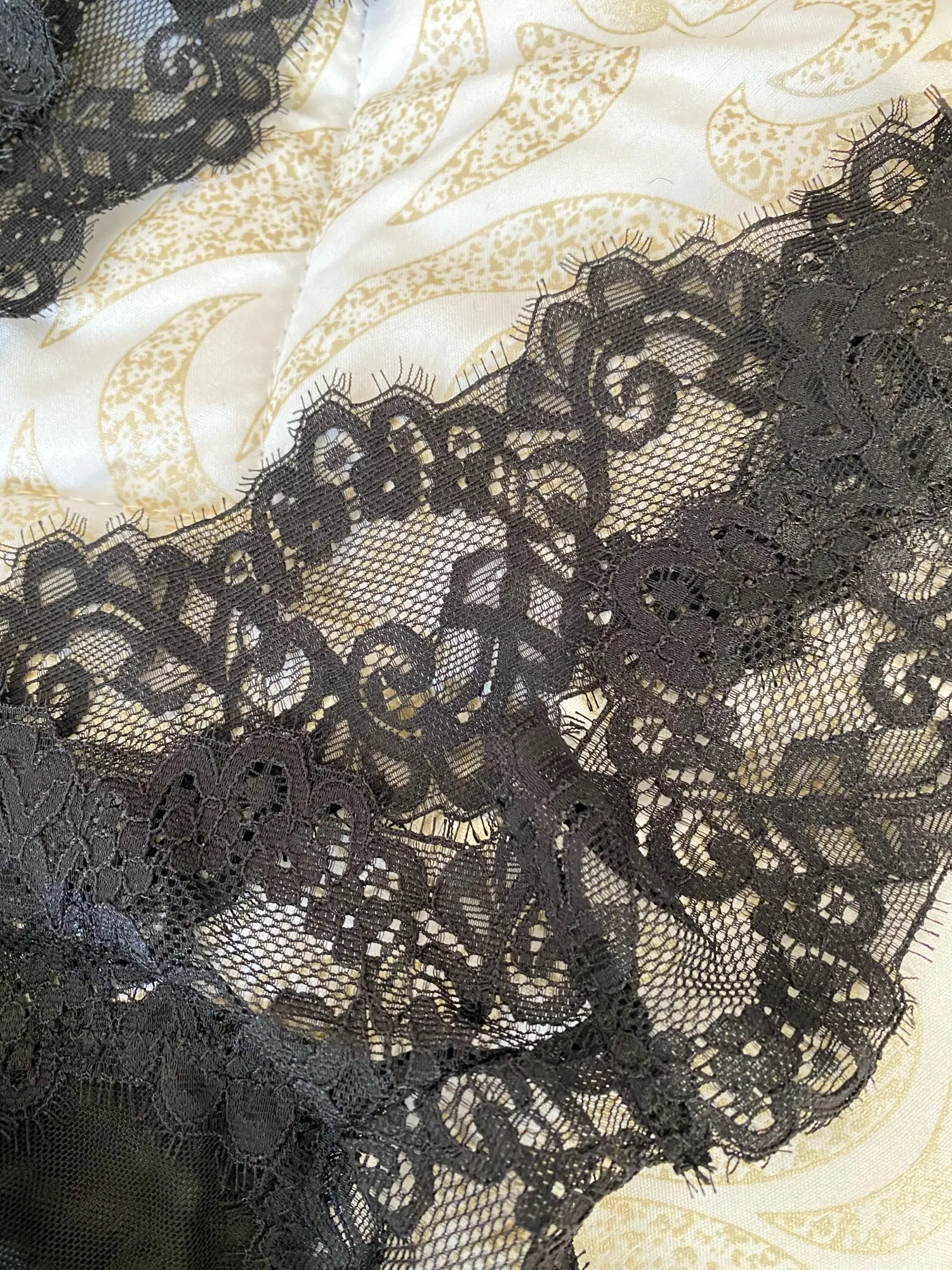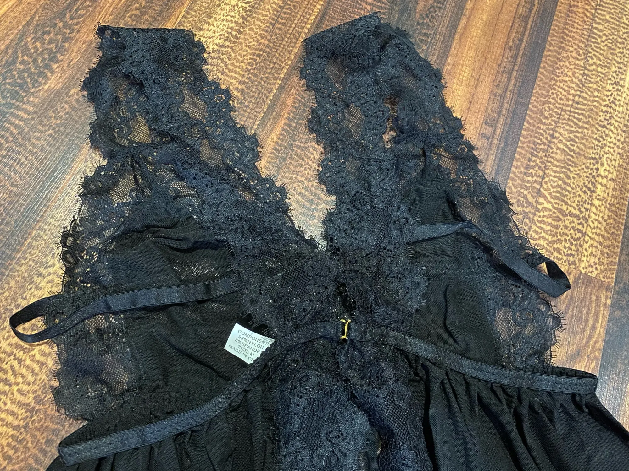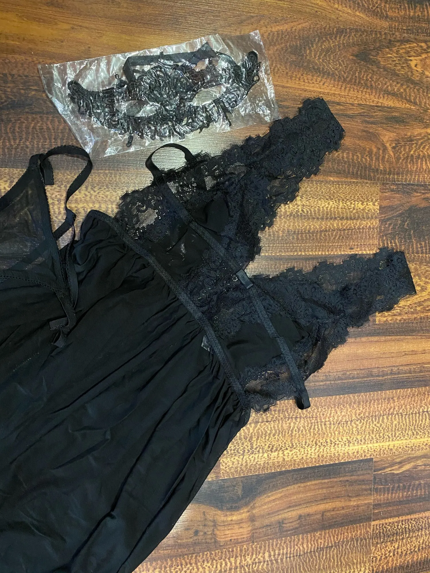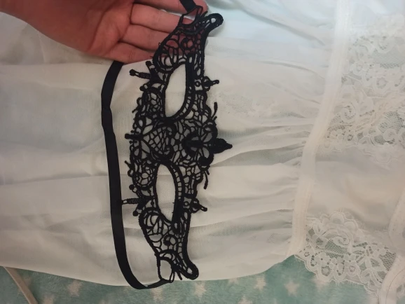 Качество хорошее, кружево не расползается. На параметры под грудью 71, грудь 77, ночнушка большая, к сожалению. По бокам резинки висят, но можно их ушить. В подарок положили маску кружевную чёрную.