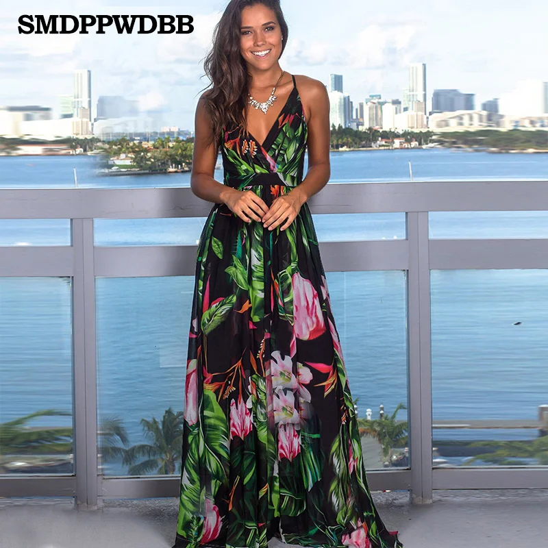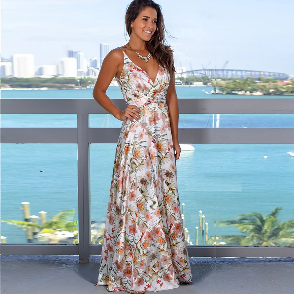 Платье-комбинация женское с V-образным вырезом, пляжная юбка с V-образным вырезом и цветочным принтом, без рукавов, летнее