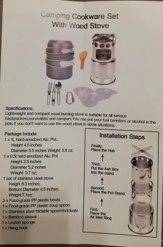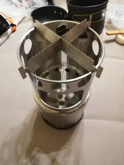 Отличный походный набор посуды! Очень компактное и легкое решение. Крестовина выполнена из нержавейки толщиной 0,8 мм. Печка-щепочница выполнена из нержавейки толщиной 0,4 мм. Было бы неплохо, если бы стенки были немного потолще. Доволен покупкой. Рекомендую магазин и продавца.