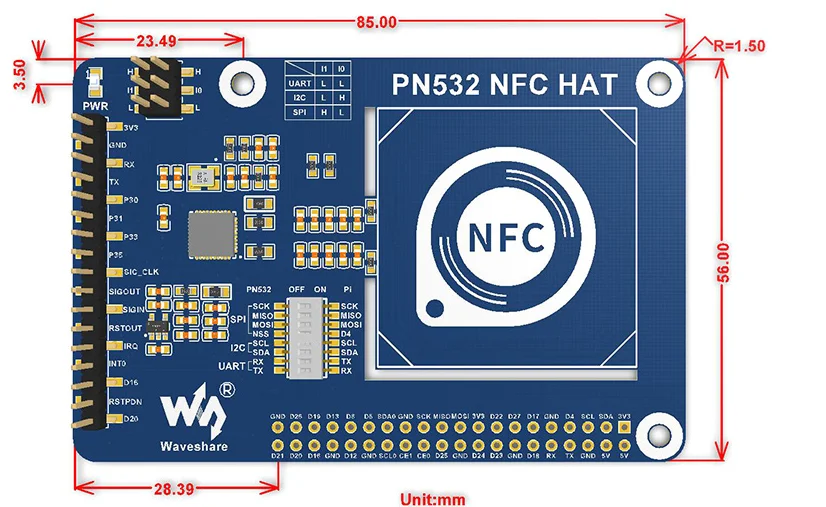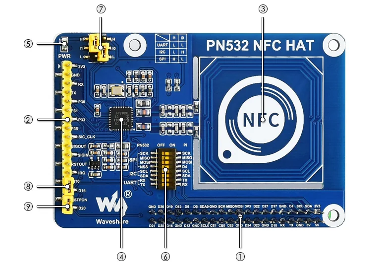 Этот продукт предназначен для связи с raspberry PI ближнего поля (плата расширения NFC, с использованием PN532, Поддержка I2C, SPI и UART трех интерфейсов, используется для связи NFC 13,56 МГц.