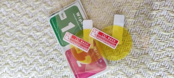 Упаковка достойная. Но качество плёнки отвратительное. В комплекте 3 шт. Не одну не удалось наклеить, пузырится. Возможно из за долгой доставки, попросту высохла основа.