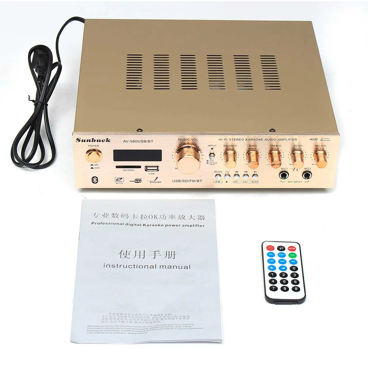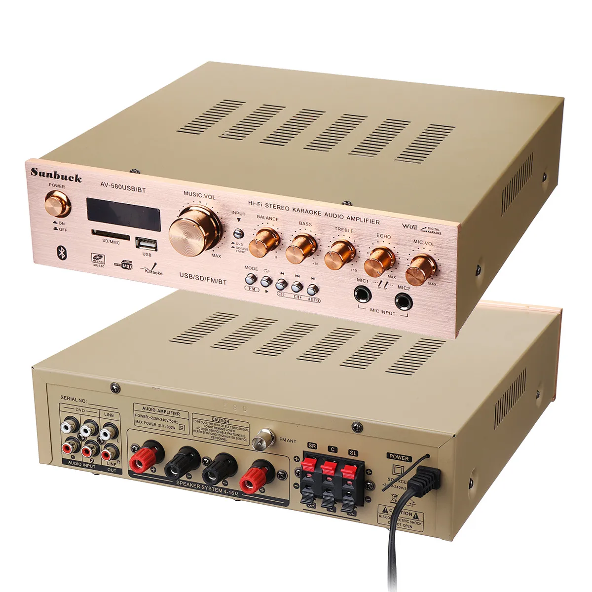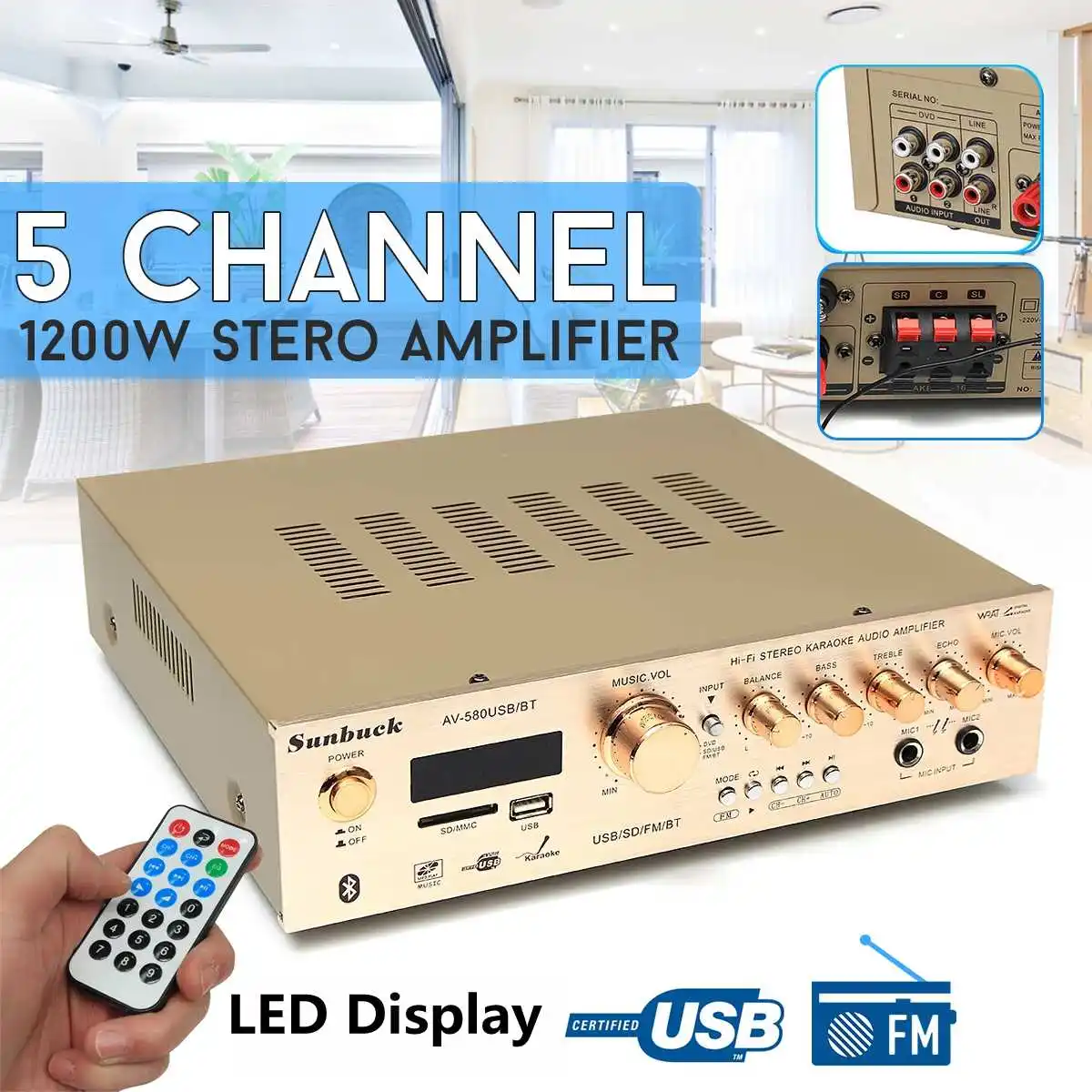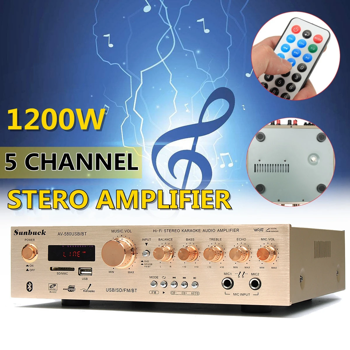 Усилитель объемного звучания Sunbuck, 1200 Вт, bluetooth 5,0, 5-канальный усилитель, поддержка FM-радио, USB, SD-карты, двойной микро-вход, усилители для караоке