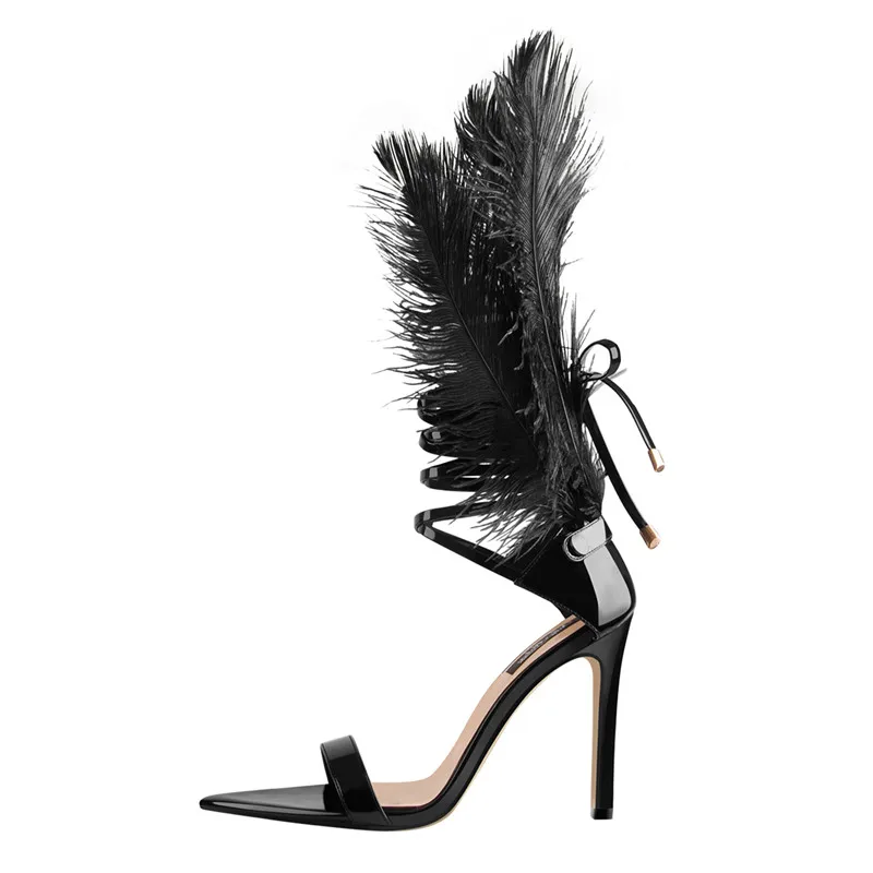 Женские босоножки Onlymaker, черные босоножки на шпильке 10 см, с перьями, на шнуровке, с острым носком, под платье, для вечеринки