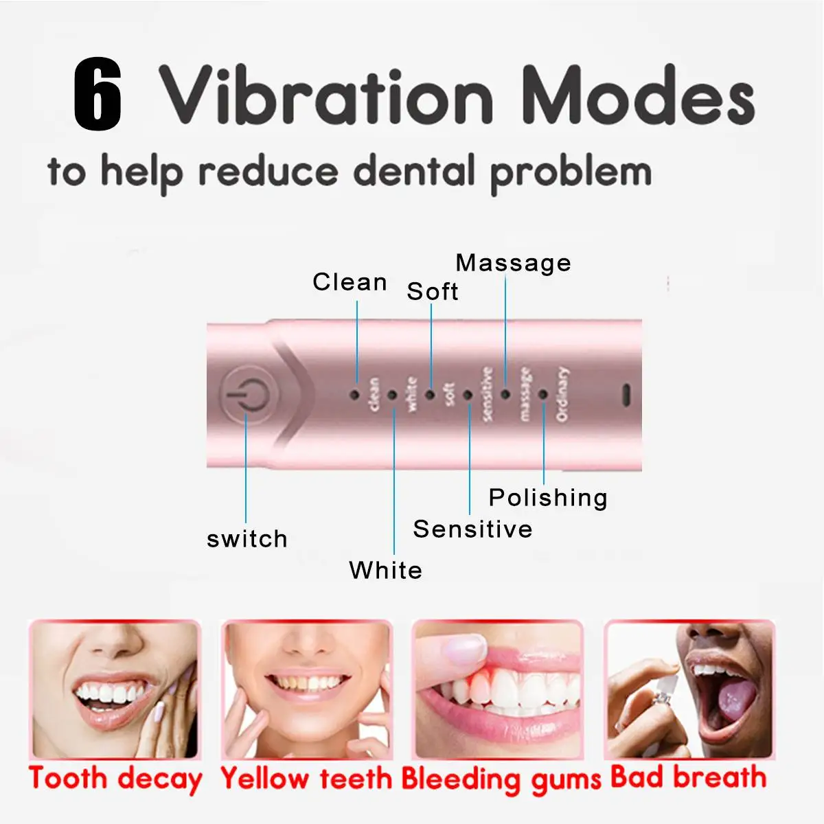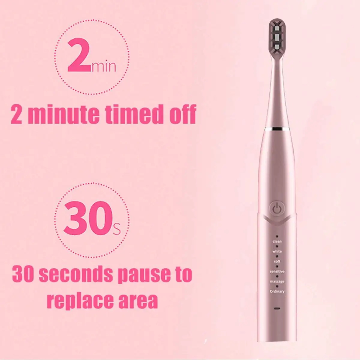 Водонепроницаемая электрическая зубная щетка IPX7 Sonics для взрослых с таймером, 6 режимов, зарядка через USB, сменные головки зубных щеток, набор