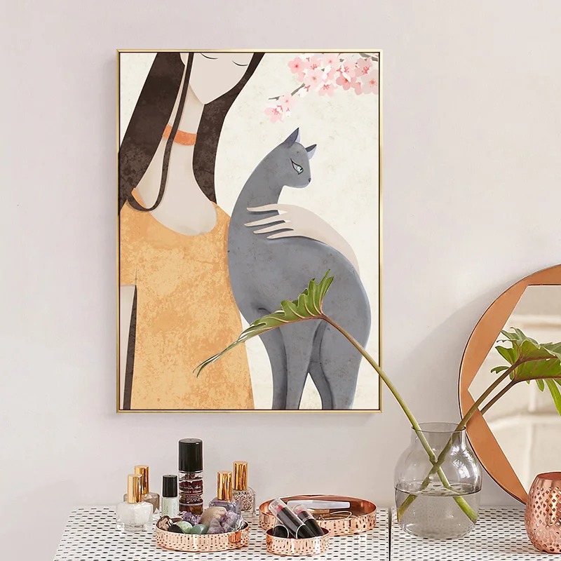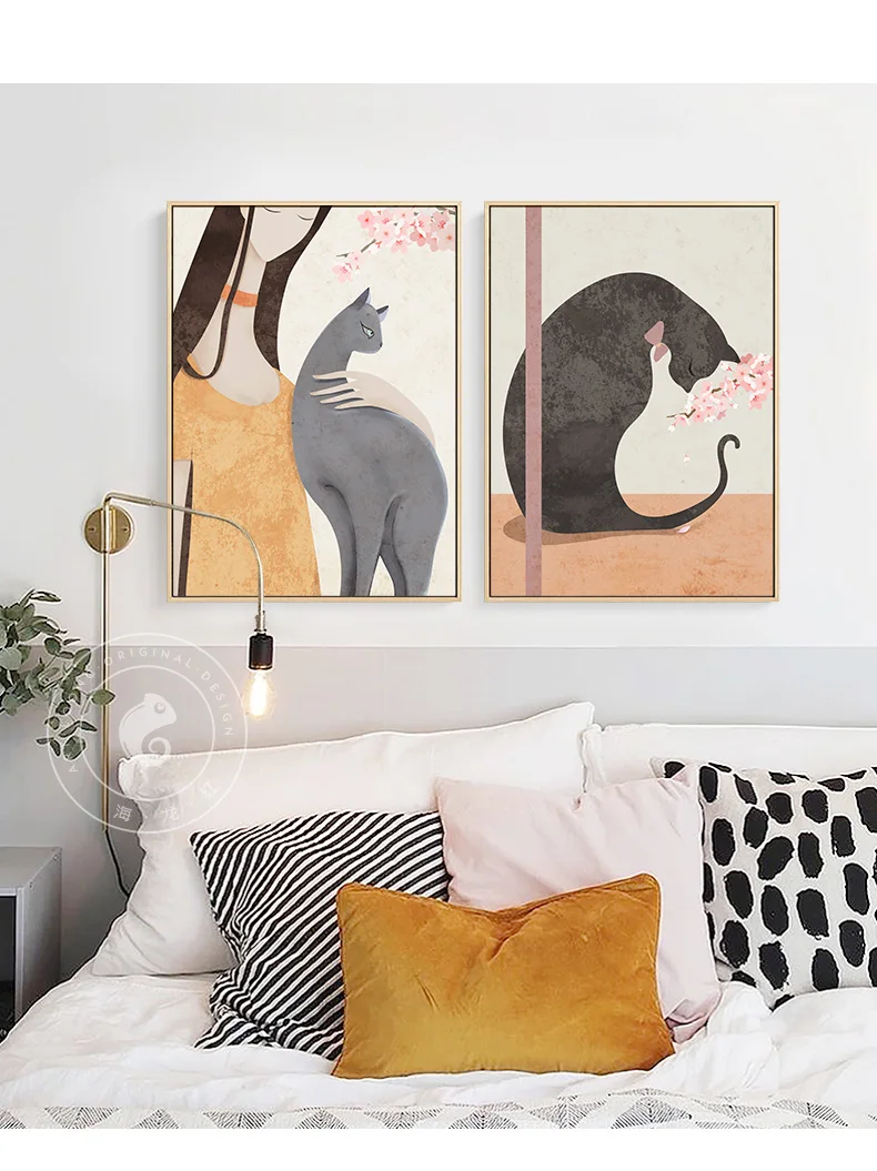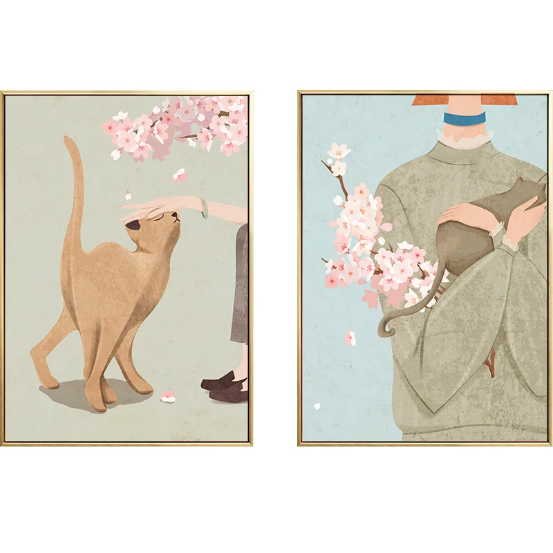 Скандинавские девушки ленивые коты Картина на холсте вишневые цветы плакаты и принты минималистичные настенные картины для гостиной спальни
