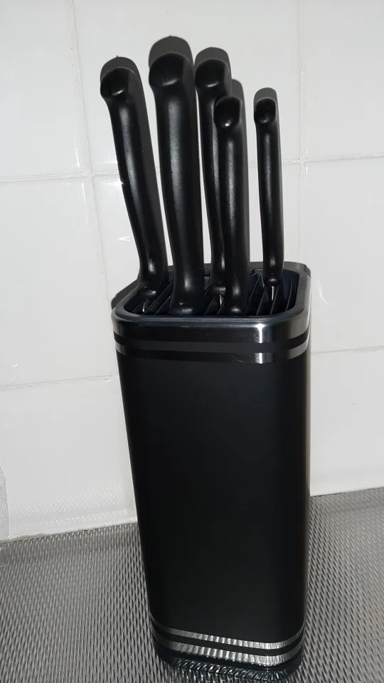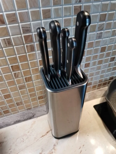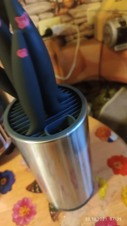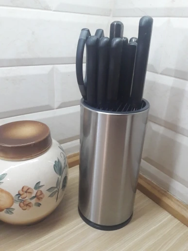 крутая подставка, точно такая же как на фото. пришла очень быстро, без повреждений. пользоваться удобно. наши 7 ножей и ножницы влезли!