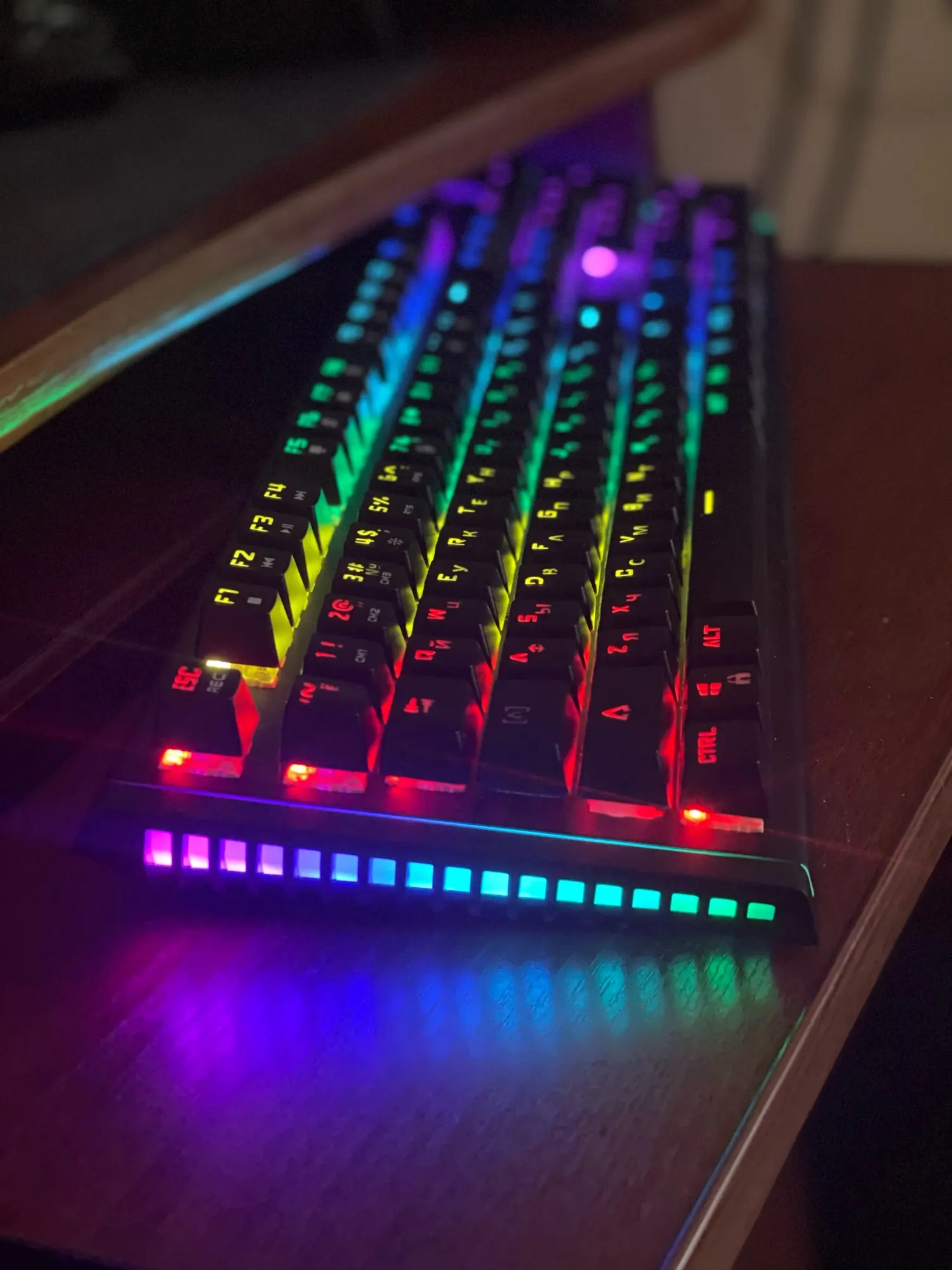 клавиатура классная, работает очень хорошо. русские буквы тоже подсвечиваются, есть дополнительные русские наклейки. спасибо продавцу.