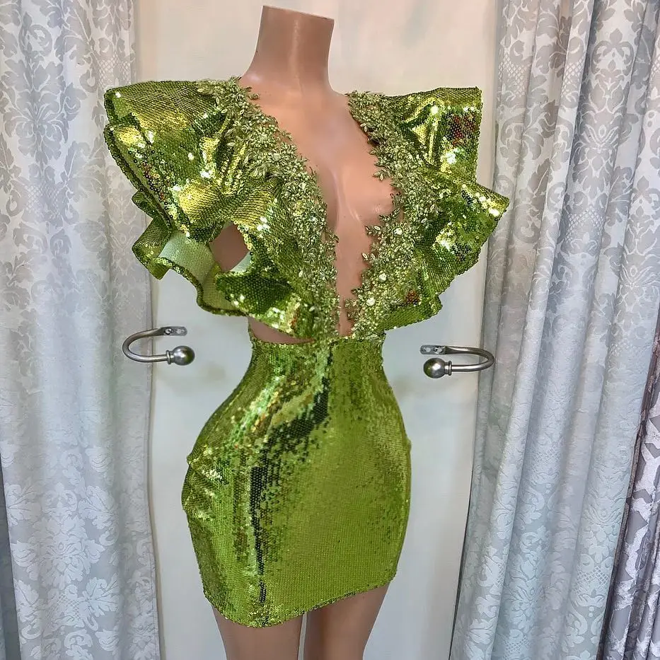 Современное зеленое коктейльное мини-платье с блестками и бисером P...