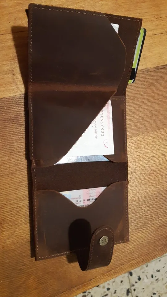 Супер быстрая доставка. Кошелек изготовлен из натуральной кожи, гравировка не очень видна, но это, вероятно, лучше. Кожа довольно тонкая (и только один слой), а швы имеют свойство распутываться. Также кожа окрашивает квитанции, когда вы вставляете их внутрь. Держатель карты хороший, карты не падают (даже если есть только один), может вместить до 7 карт. В целом это приемлемо для такой цены.