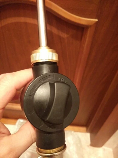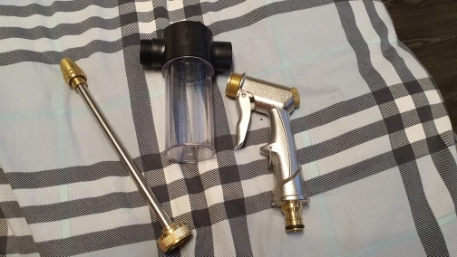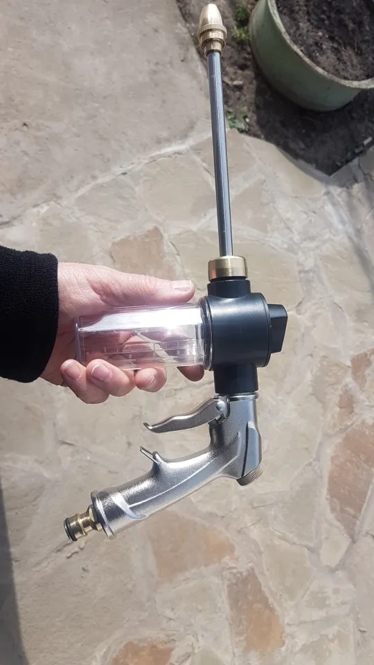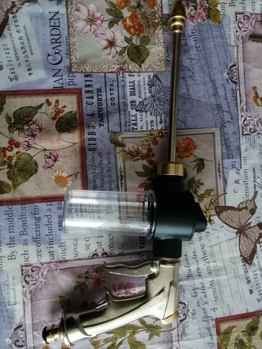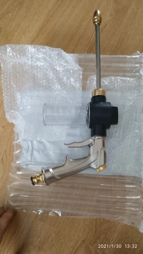 Товар шёл чуть больше месяца. Выглядит неплохо,проверить пока нет возможности. На первый взгляд,уплотнители из пластика долго не прослужат,нужно будет менять регулярно. Переключатель сверху с фиксированными 3 позициями подачи шампуня. Есть возможность регулировки дюзы и подаваемого давления.