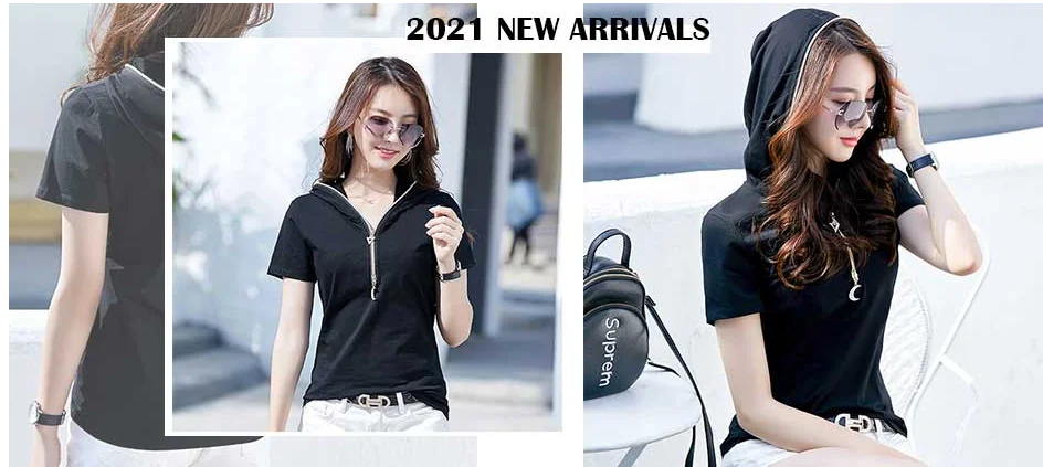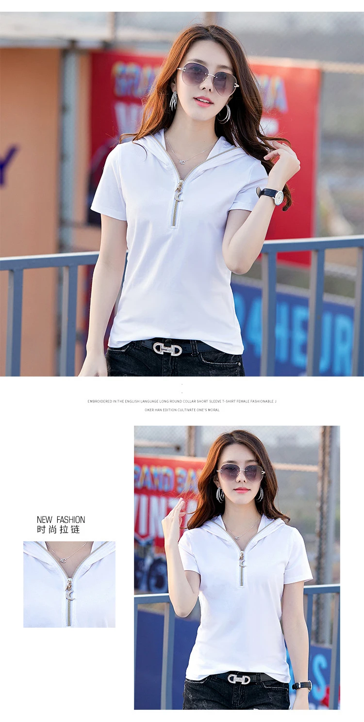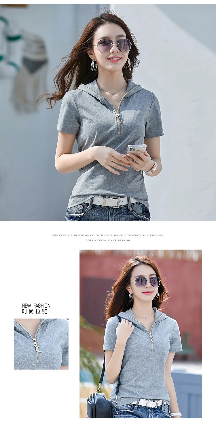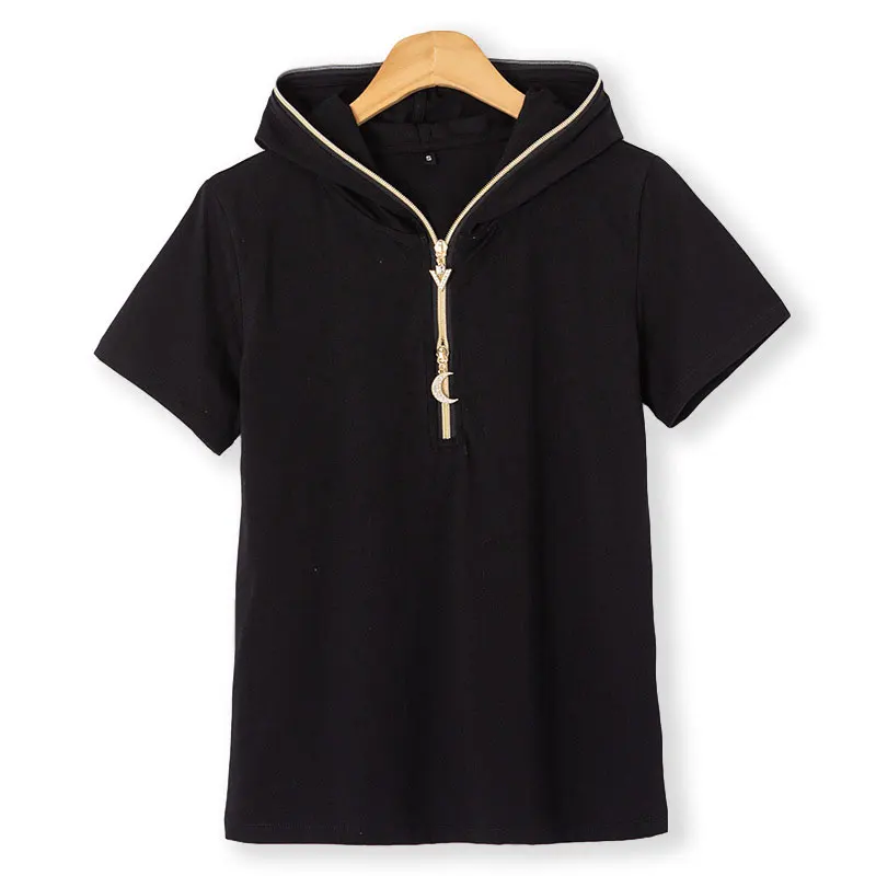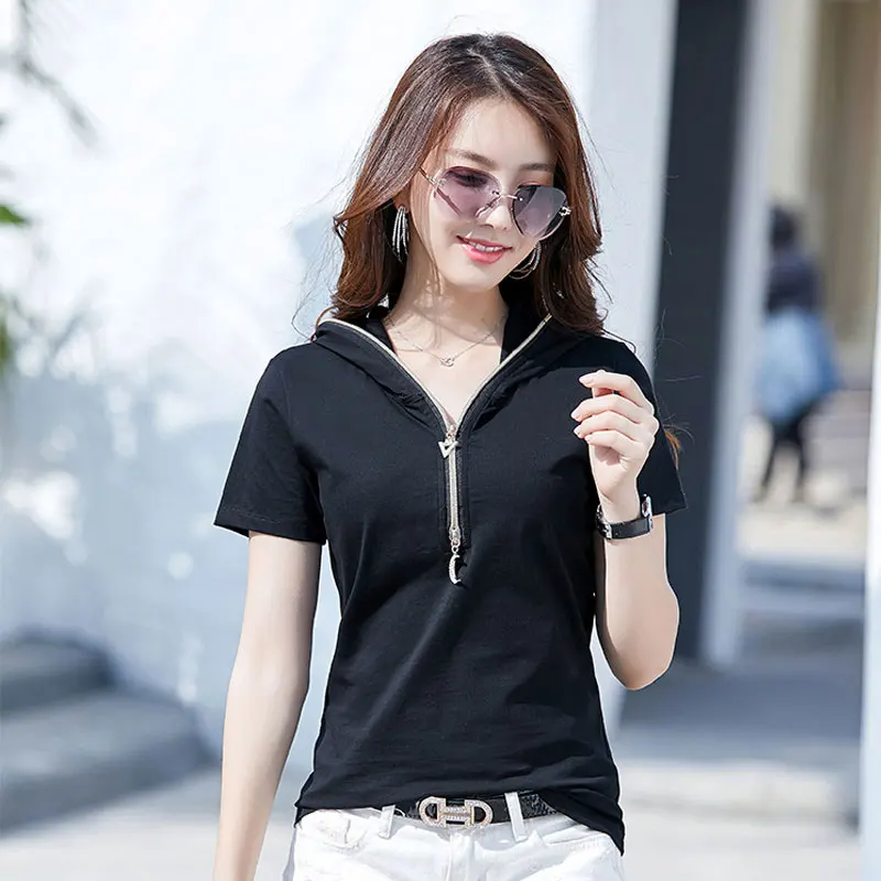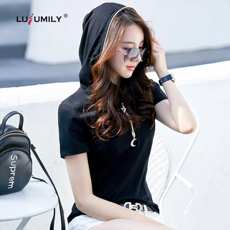 Новинка 2022, футболка Lusumily на молнии с капюшоном, женские черные летние футболки, футболка с коротким рукавом в Корейском стиле, модель 3xl, футболка, топы для девочек