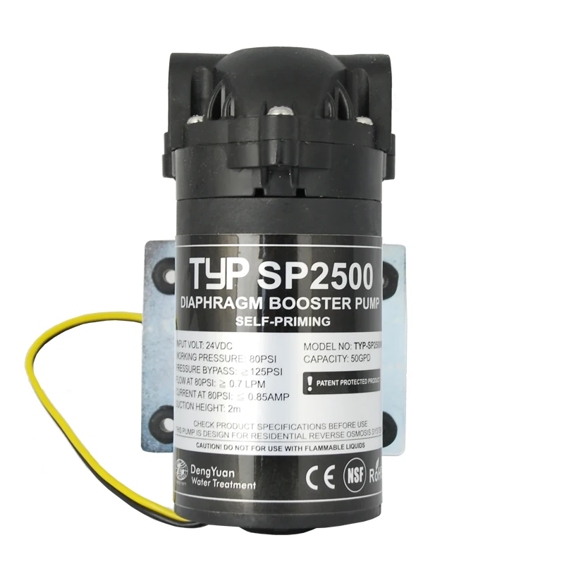 Эти насосы SP2500 доступны с расходом 50 gpd и могут использоваться в жилых системах обратного осмоса, кофемашинах, торговых автоматах и т. д. без необходимости давления подающей воды.
