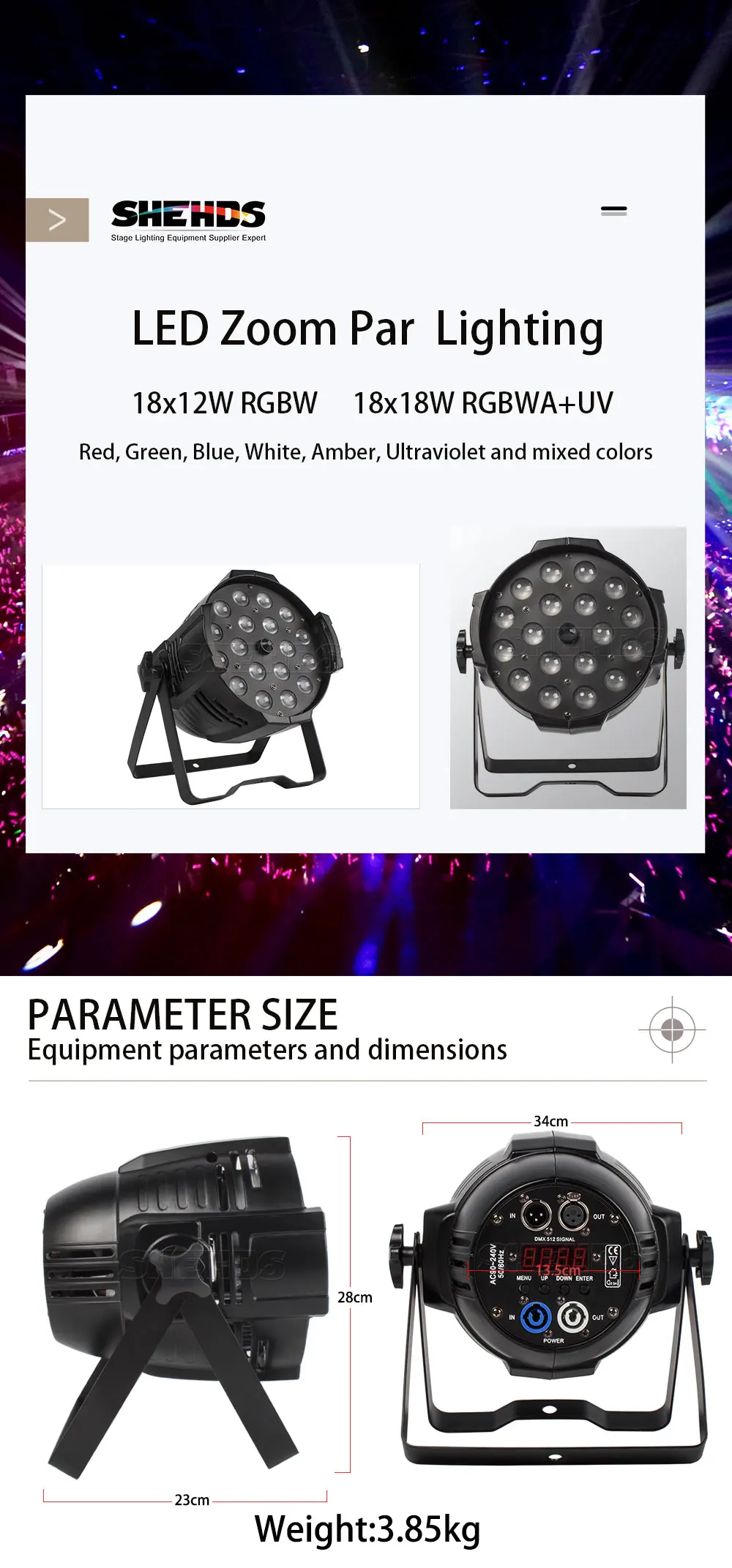 Номер модели: SHE-ZAP1812D ; SHE-ZAP1818FОбщая мощность: 216 Вт; 324 ВтВходное напряжение: 90-240 В переменного тока, 50-60 ГцDMX-Каналы управления: 5/10 DMX каналов; 7/11 DMX каналовКонтрольный сигнал: международный стандарт DMX512Длительный срок службы светодиодов: более 60000 часовРежимы работы: DMX512, автоматический запуск, звуковое действие, стробоскоп, автономный и мастер/раб, с богатой усовершенствованной встроенной программойСтруктура материала: литая алюминиевая оболочка, черный корпусУровень защиты: IP20 (в помещении)Размер изделия: 22x22x24смПродукт Вес: 3,5 кгСертификат: CE & ROHS & UL & SAAГарантия: в течение 2 лет мы можем бесплатно отремонтировать, предоставить любые аксессуары или отправить новые продукты.Штепсельная Вилка: для отправки в соответствии с требованиями штепсельной вилки, штепсельной вилки ЕС, штепсельной вилки США, штепсельной вилки Австралии, штепсельной вилки Великобритании и т. Д. Для использования помещений: внутри помещений, сцены, ночных клубов, дискотек, отели, магазины, семейная вечеринка на день рождения, подходит для ди-джеев и т. д.