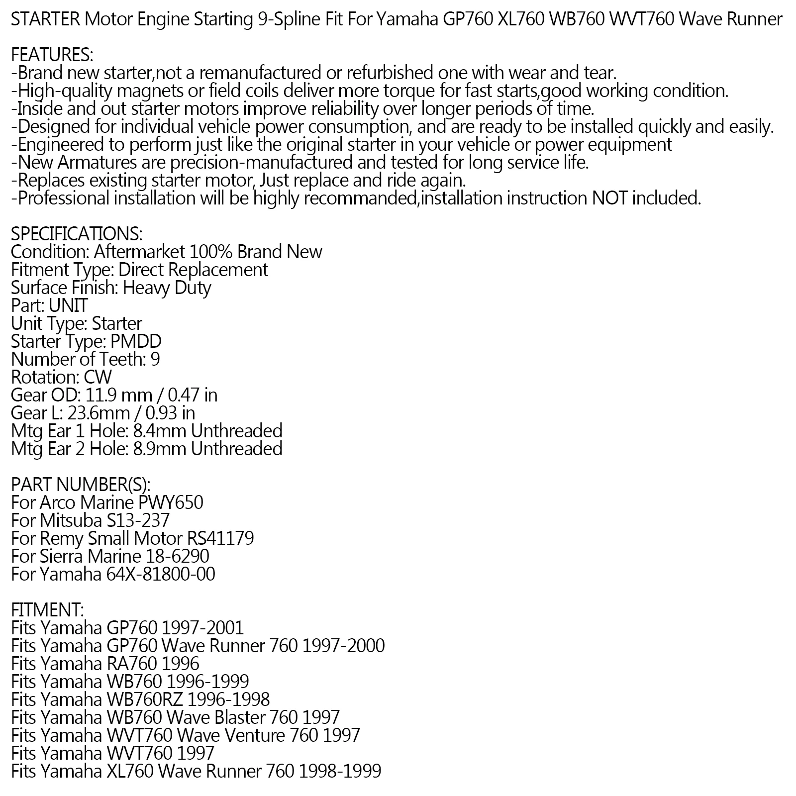 Стартер запуск двигателя 9-Сплайн подходит для Yamaha GP760 XL760 WB760 WVT760 волна БегунОсобенности:-Совершенно новый стартер, не Восстановленный или Восстановленный с износом.-Высококачественные магниты или полевые катушки обеспечивают больший крутящий момент для быстрого запуска, хорошее рабочее состояние.-Внутренние и внешние стартовые двигатели повышают надежность в течение более длительного периода времени.-Предназначен для индивидуального потребления энергии транспортного средства и готов к установке быстро и легко.-Разработан для выполнения так же, как оригинальный стартер в вашем автомобиле или силовом оборудовании-Новые арматуры изготовлены с точностью и протестированы на долгий срок службы.-Заменяет существующий стартовый двигатель, просто заменяет и катается снова.-Профессиональная установка будет строго заменена, инструкции по установке не включены.Характеристики:Состояние: Aftermarket 100% Новый брендТип установки: прямая заменаОтделка поверхности: сверхмощныйЧасть: блокТип устройства: стартерТип стартера: PMDDКоличество зубов: 9Вращение: CWШестерни OD: 11,5 мм/0,45 вШестерня L: 18,8 мм/0,74 дюймаMtg плюшевый кролик уха 1 отверстие: 8,3mm без резьбыMtg ухо 2 отверстия: 8,3 мм без резьбыНомер детали (ов):Для Arco Marine PWY650Для Mitsuba S13-237Для небольшого двигателя Remy RS41179Для Sierra Marine 18-6290Для Yamaha 64X-81800-00Приспособление:Подходит для Yamaha GP760 1997-2001Подходит дляДляYamaha GP760 Wave Runner 760 1997-2000Подходит дляДляYamaha RA760 1996Подходит дляДляYamaha WB760 1996-1999Подходит дляДляYamaha WB760RZ 1996-1998Подходит дляДляYamaha WB760 Wave Blaster 760 1997Подходит дляДляYamaha WVT760 Wave Venture 760 1997Подходит дляДляYamaha WVT760 1997Подходит дляДляYamaha XL760 Wave Runner 760 1998-1999Подходит дляДляYamaha XL760 1998-1999Посылка включает в себя:1x Новый стартерПримечание:Совместимость только для справки, пожалуйста, проверьте размер и номер детали подходит для вашего мотоцикла или нет.Это часть послепродажного обслуживания, а не оригинальная.