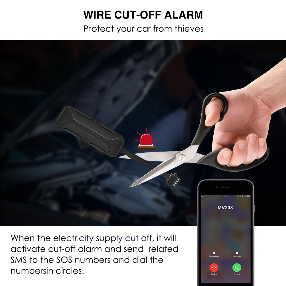 Защитите свой автомобиль от воров;Когда подача электроэнергии отключена, он активирует отключение сигнала тревоги и отправит соответствующее SMS на номера SOS и наберите число кругов.