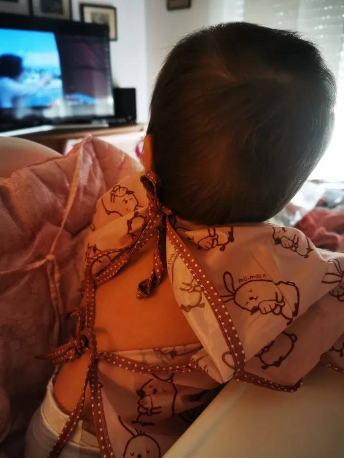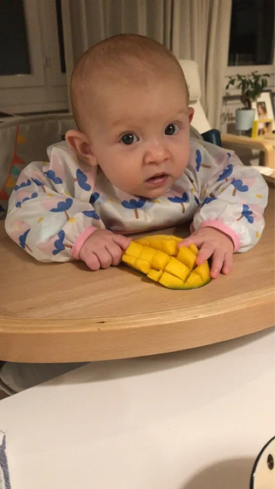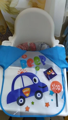 На 6 месяцев немного больше, но можно затянуть завязки сзади. Хорошее качество. Нет запаха. Не беспокоить ребенка во время еды. Легко чистить.