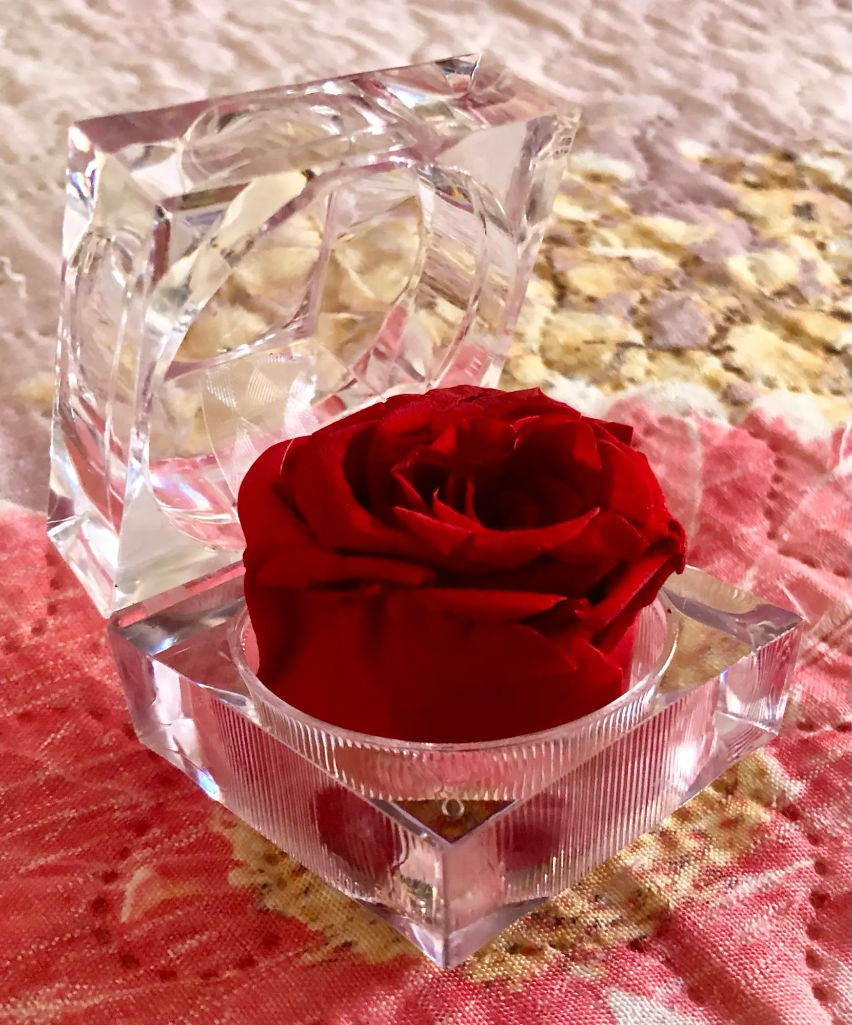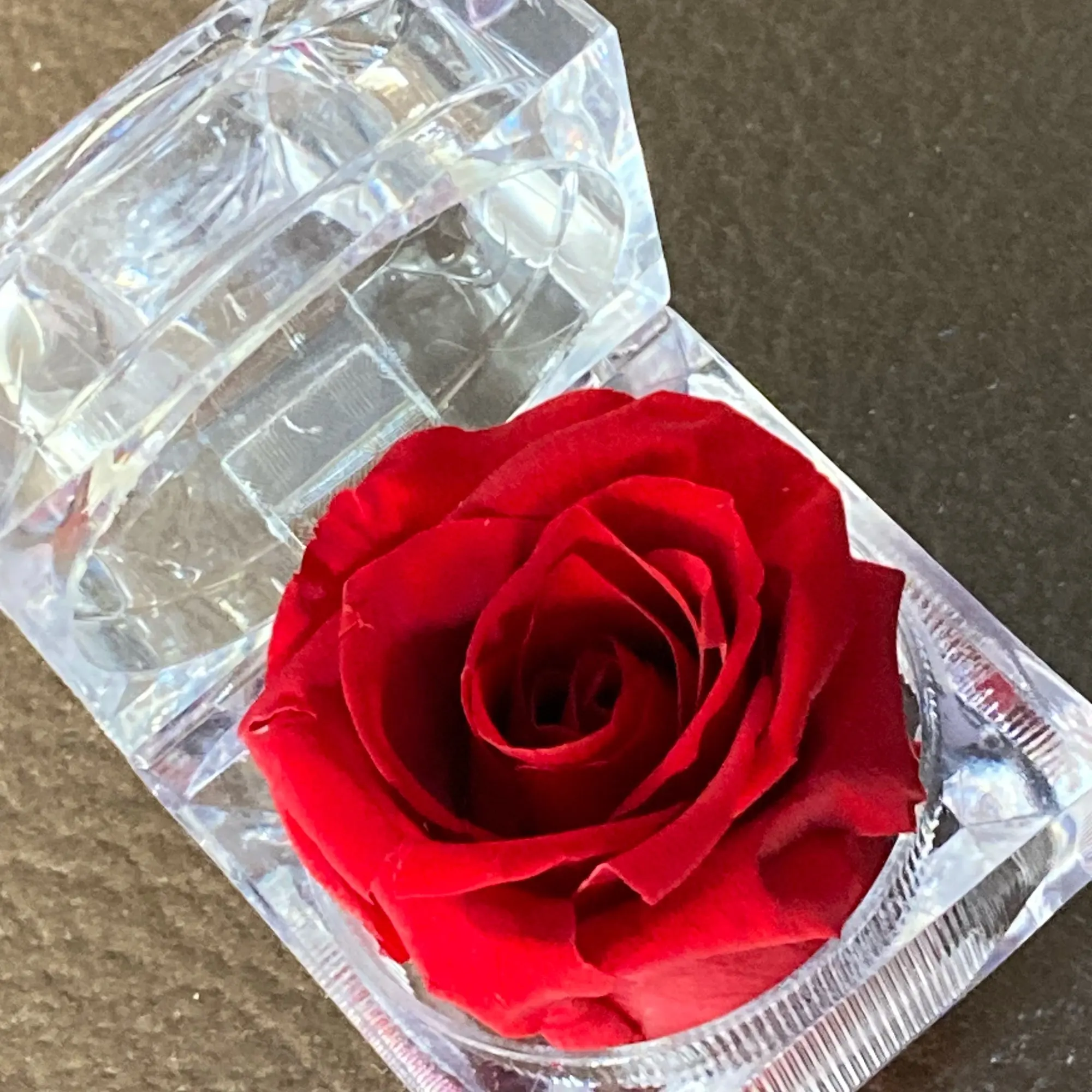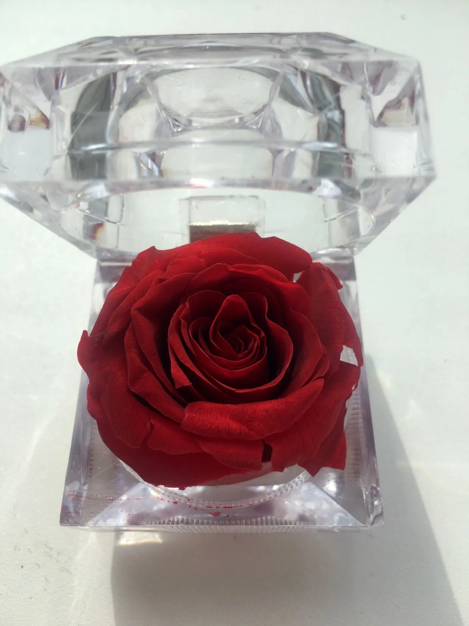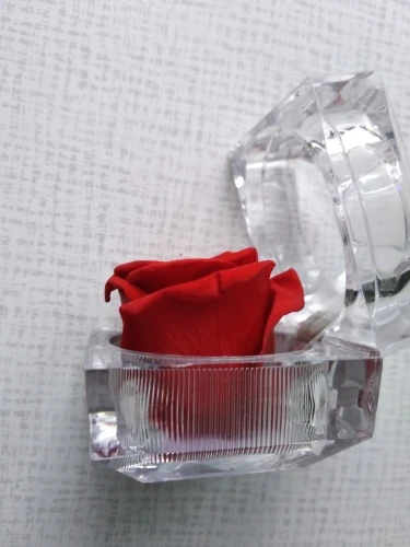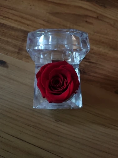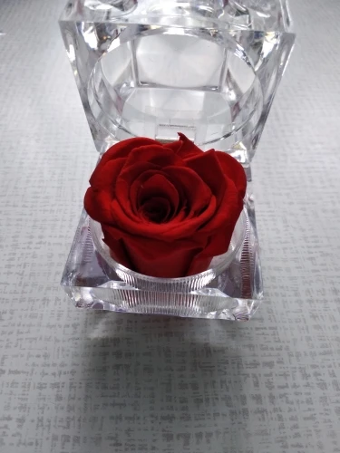 Красный цвет в многогранной и прозрачной пластиковой коробке драгоценности. Хорошо для предложения руки и сердца. Цветок настоящий и хорошо сохранившийся, соответствует изображениям и описанию. Отслеживаемый груз прибыл раньше, чем ожидалось. Серьезный продавец. -Спасибо.