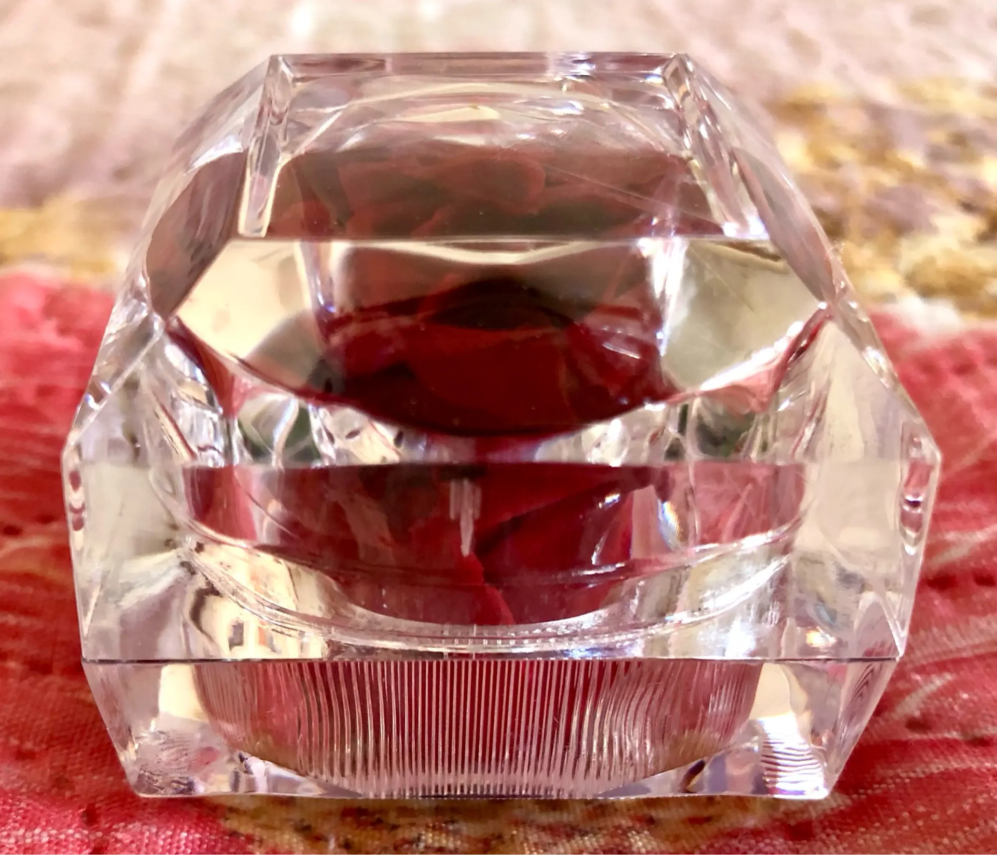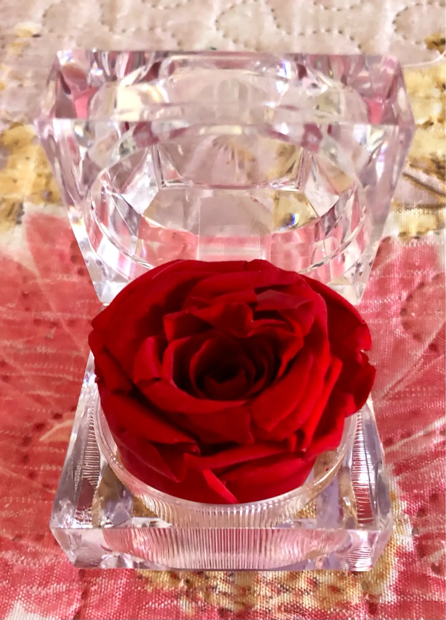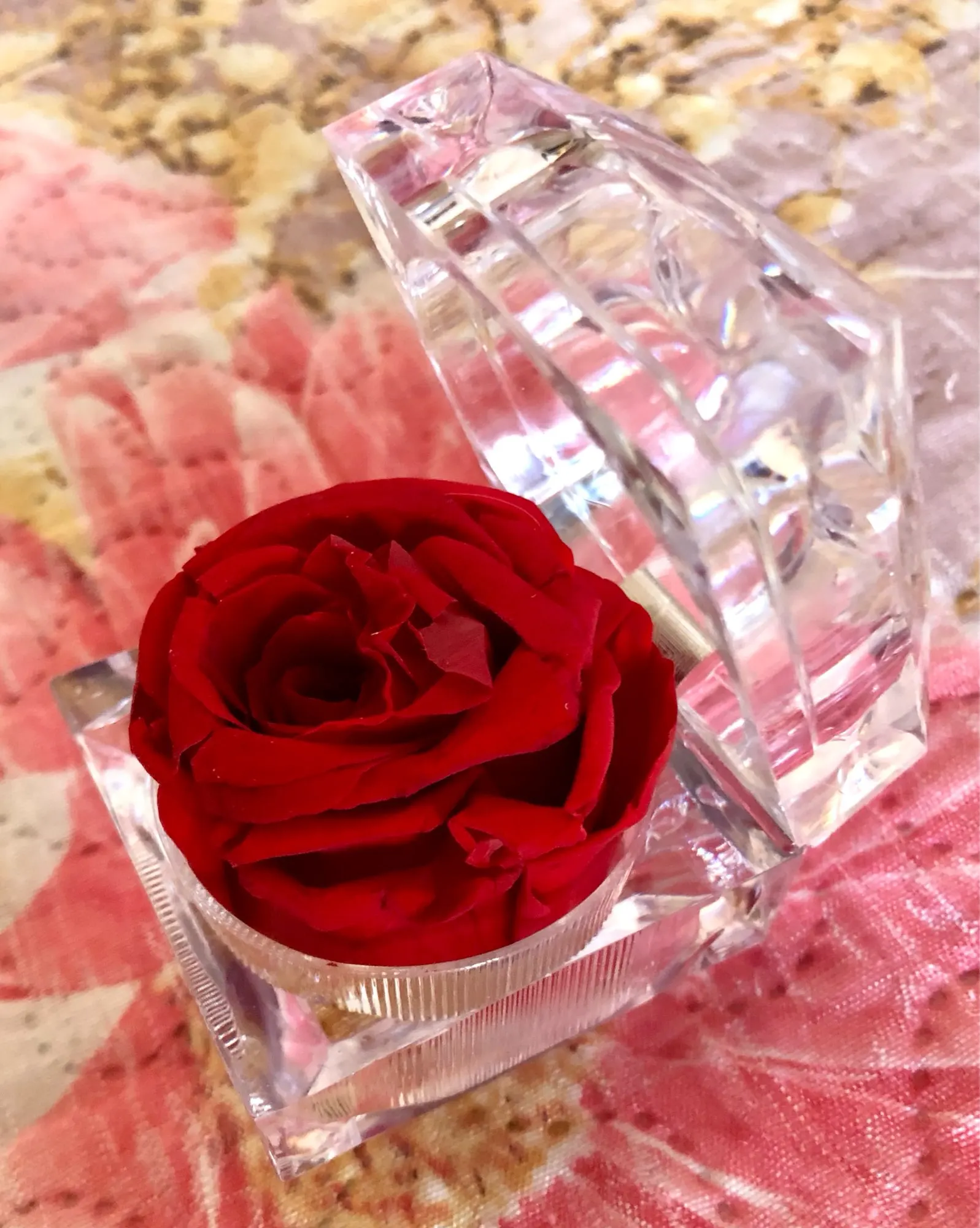 Красный цвет в многогранной и прозрачной пластиковой коробке драгоценности. Хорошо для предложения руки и сердца. Цветок настоящий и хорошо сохранившийся, соответствует изображениям и описанию. Отслеживаемый груз прибыл раньше, чем ожидалось. Серьезный продавец. -Спасибо.