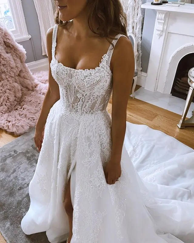 2020 сексуальный глубокий вырез кружевные бусины Топ с высоким разрезом трапециевидный шлейф пляжные вечерние свадебные платья