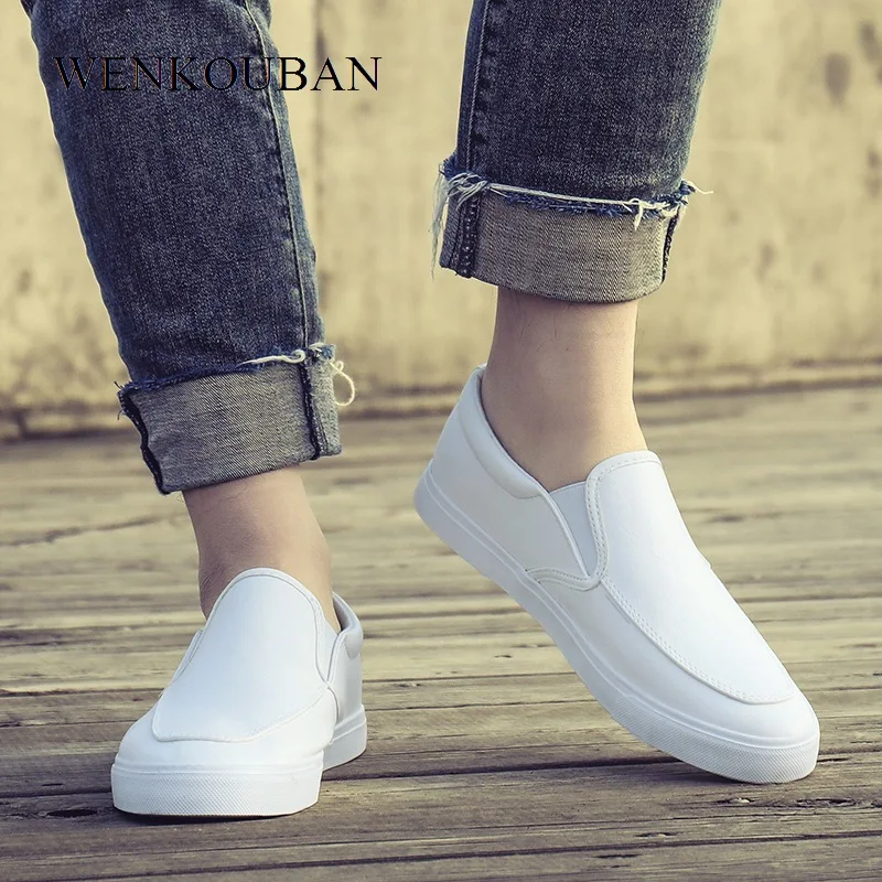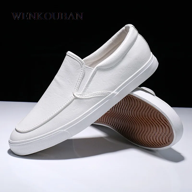 Кроссовки мужские из ПУ кожи, плоская подошва, без застежки, повседневная обувь, белые, большие размеры 39-44, летние