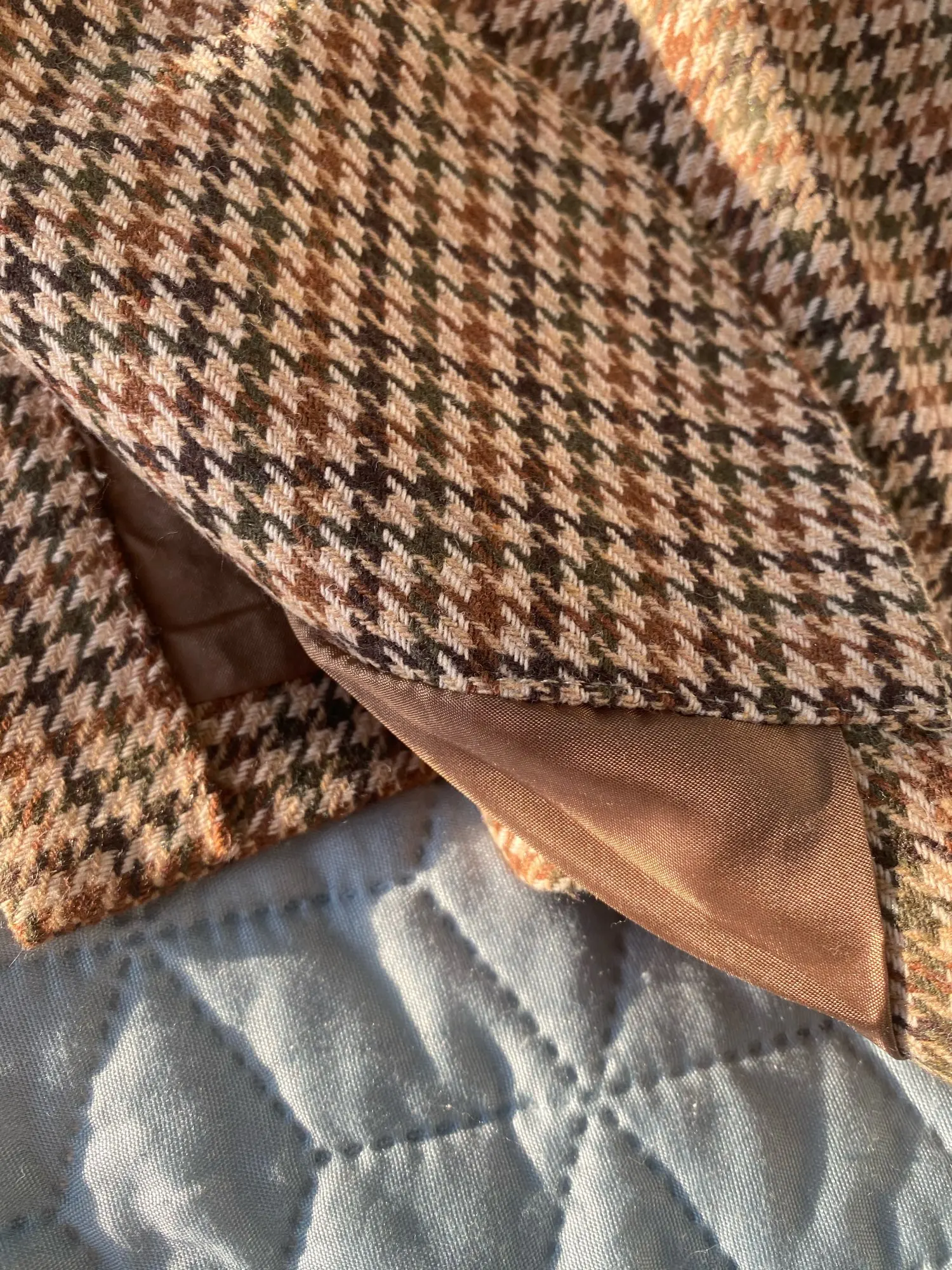 Очень красивый!) твидовый, но был неприятный затхлый запах, но после стирки все норм) не линяет, не сел