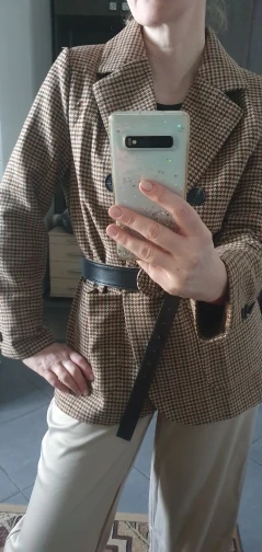 Блейзер пришёл очень быстро в Калининград, качество хорошее, плотный материал, обычно ношу Xs, размер s пришёлся как раз впору: и плечи, и рукава, и длина. Все ок. Ремешок такой себе, хлипкий. Но и без него блейзер смотрится хорошо.