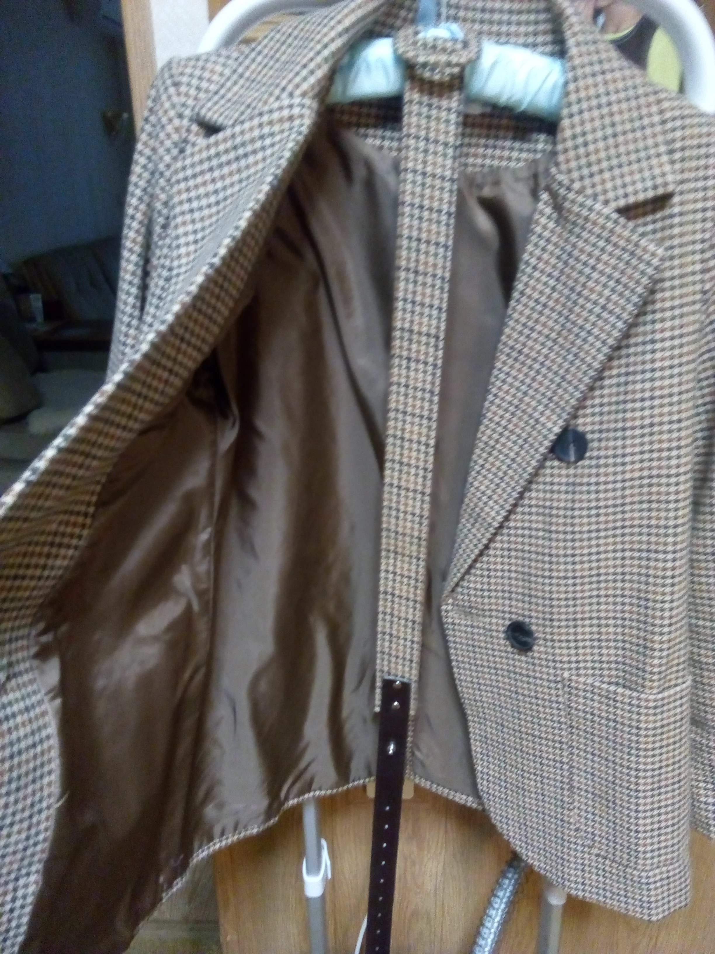 Ткань хорошая. Но крой пиджака мне не понятен. То ли у меня плечи огромные, то ли скроен он по кривым лекалам. В плечах мал, где талия - широкий. И воротник как-то уходит вверх. Возврат.
