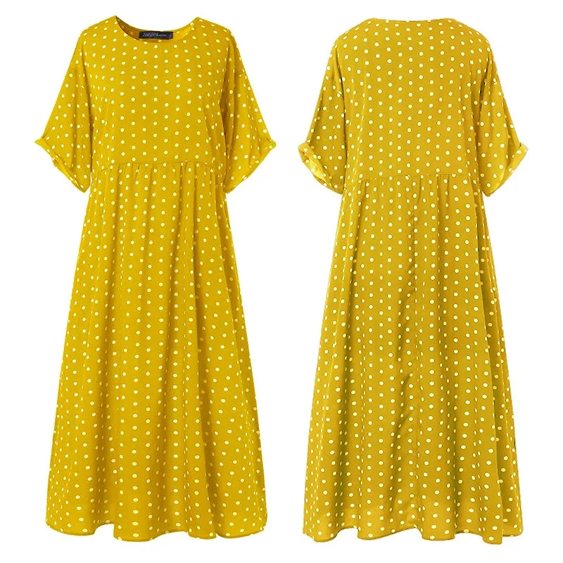Материал: 100% полиэстерЦвет: черный, темно-синий, розовый, желтый, зеленыйПосылка входит: 1 платьеДетали продукта:-Короткий рукав-О-образный вырез-Многоцветный-Простой и удобный-Боковые карманы-Длина по щиколотку-Платье в горошек