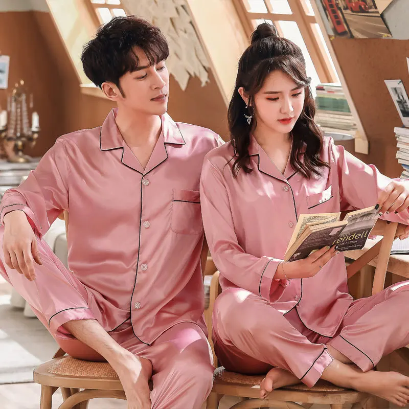 Шелковые пижамные комплекты для пары, женская одежда для сна с длинным рукавом, Повседневная Пижама, однотонные мужские пижамные комплекты, летние шелковые пижамы
