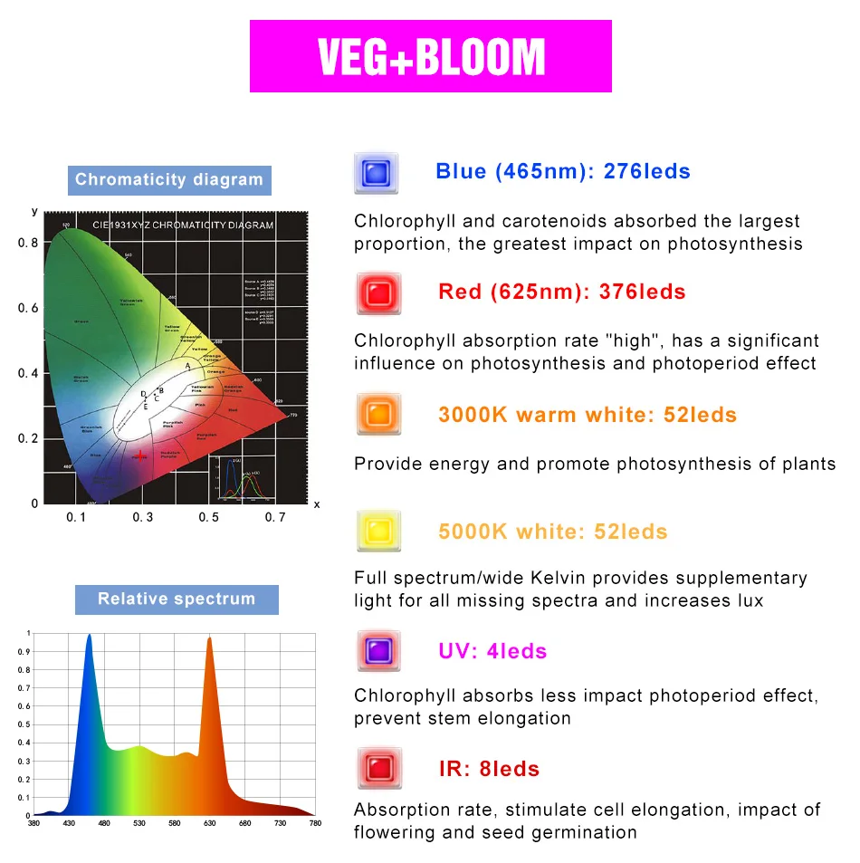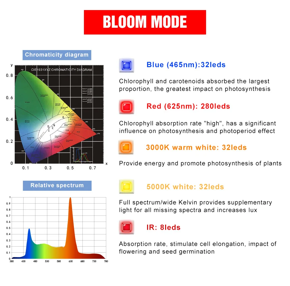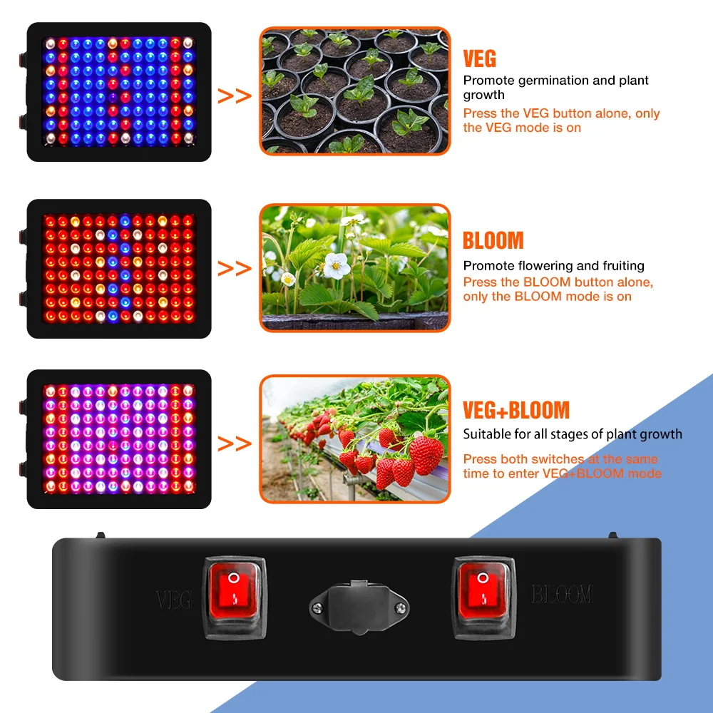 *Три режима работы, режим роста и прорастания растений, режим цветения способствует цветению и плодоношению, режим VEG + BLOOM подходит для всех этапов роста растений.