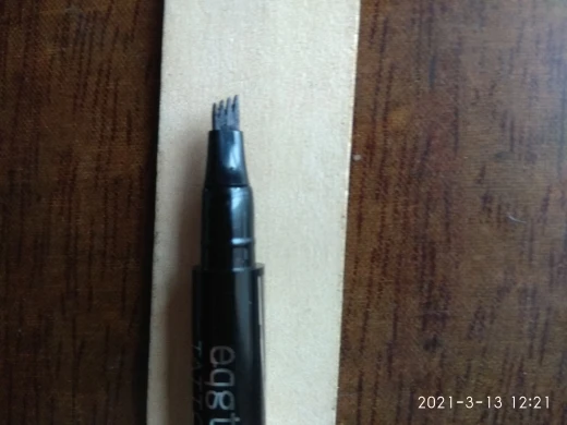 Пришёл за 12 дней!!! Для меня рекордно быстро!!! Кисточка мягкая (вроде селикона) , рисует полосочками, как волоски-здорово. Попробовала сначала на руке, потом пошла готовить и помыла руки раз 7,и штрих ни на грамм не смылся!!! Сразу заказала ещё один карандаш маме)))