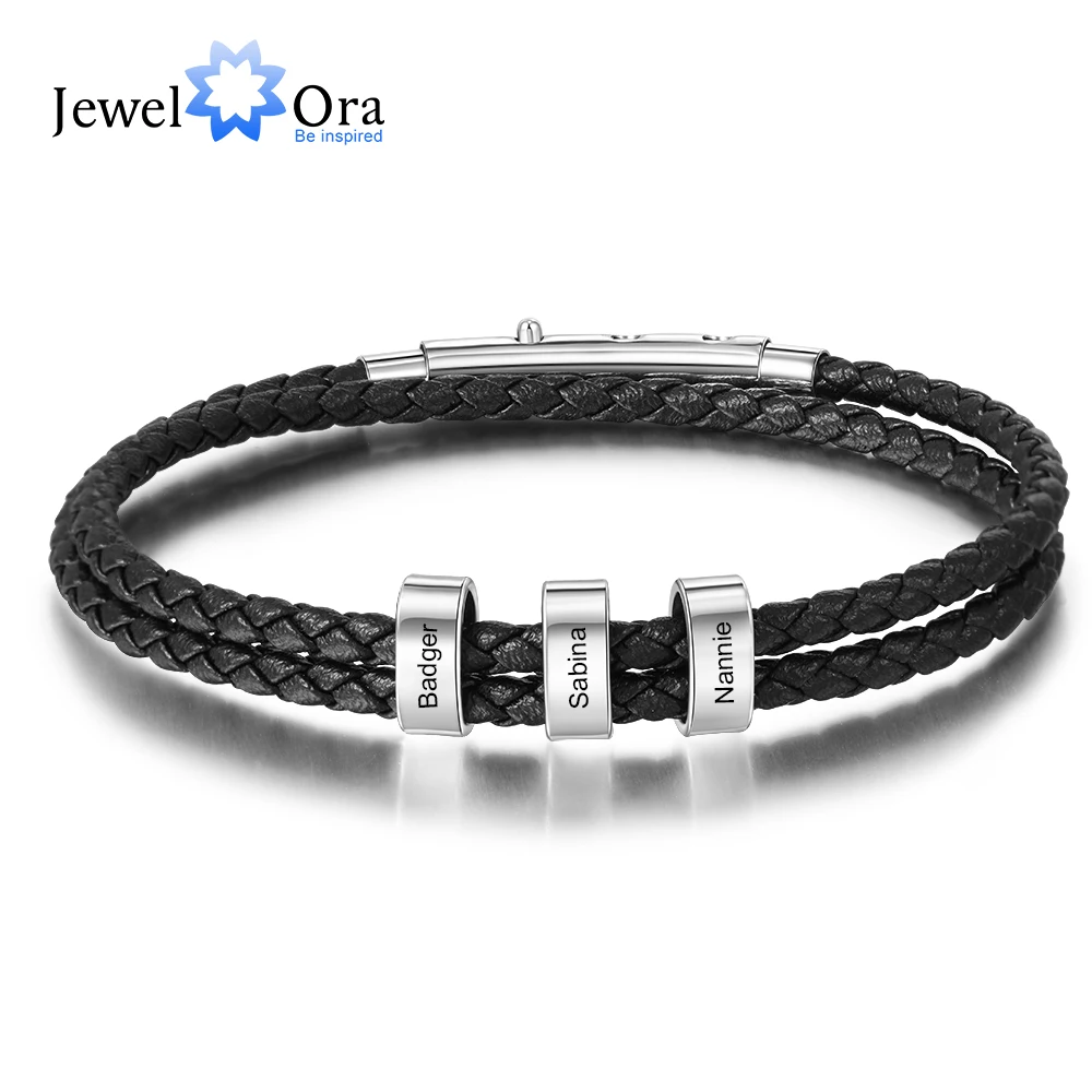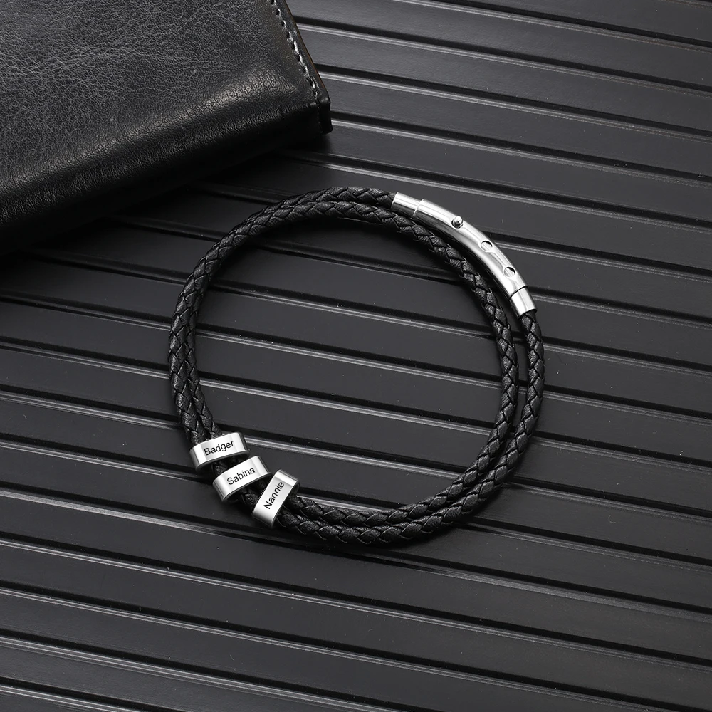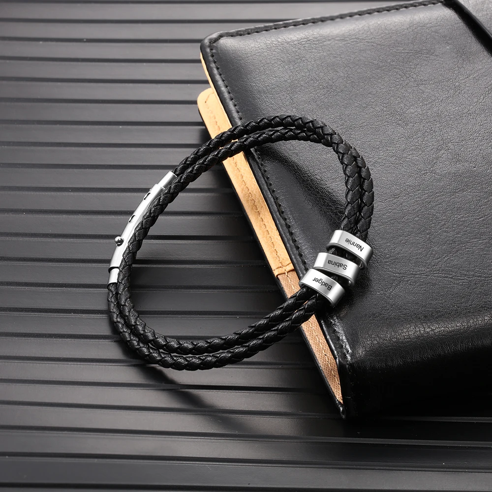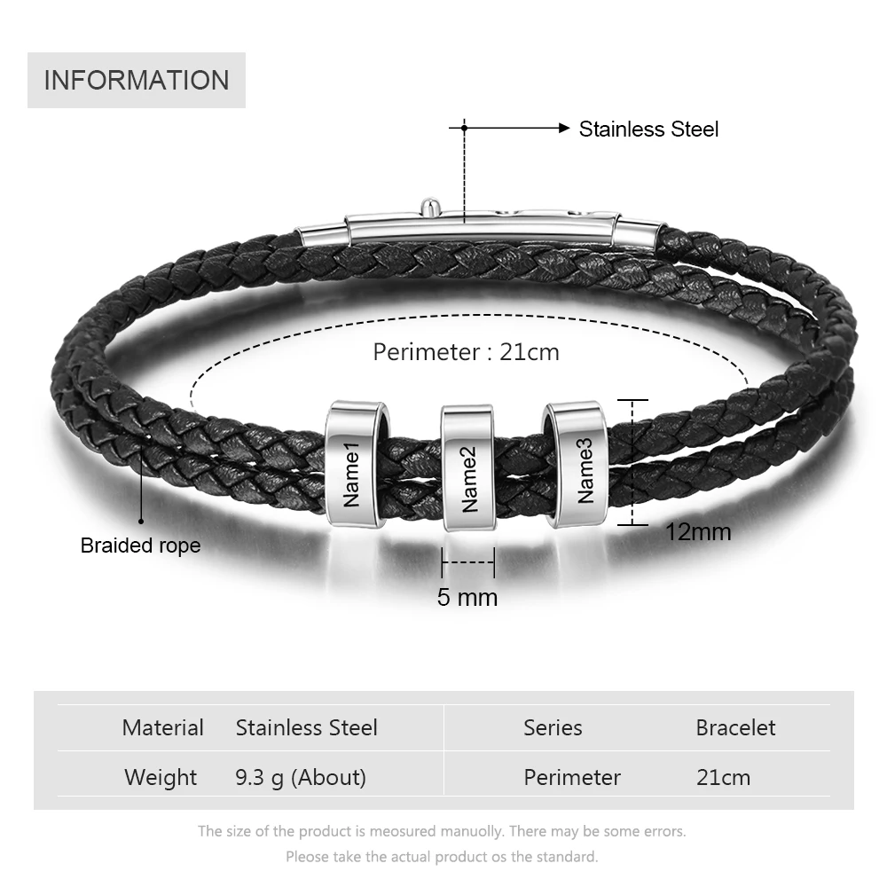 Мужские кожаные браслеты с тремя именами на заказ, черные, с двойной веревкой, из нержавеющей стали, с гравировкой, мужские ювелирные изделия