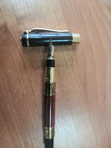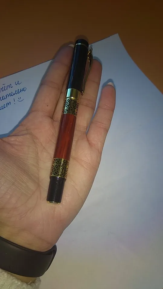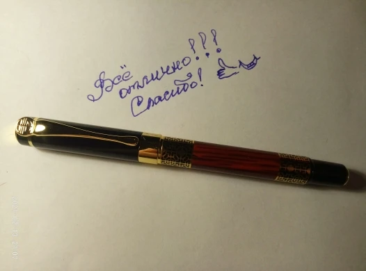 Ручка очень красивая! Выглядит "богато"! Массивная, что даёт "плюс". Один недостаток (для меня) - колпачок не фиксируется на задней стороне ручки! С продавцом не общался.