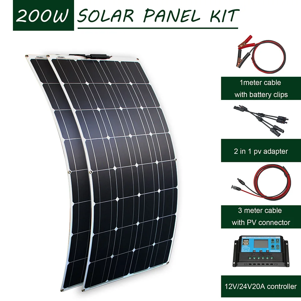 Солнечная панель, 2 шт., 12 В, 100 Вт Контроллер 12 В/24 В 20 А, 1 шт. 1 комплект 3-метрового Кабеля с солнечным PV разъемом 1 комплект 1 метр кабеля с зажимами для батарей 1 пара 2 в 1 PV адаптер
