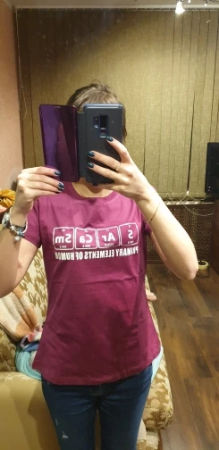 Хорошая футболочка буду носить,, единственное конечно полная синтетика, но как говориться я знала на что шла, хотела свободную, норм, на бюст 101 и ОТ 80 вполне свободно. НА фото выглядит как будто она пополам одна сторона светлее, другая темнее, не пугайтесь, это тень! у меня дома такой свет майка сплошная без оттенков! Пришло за месяц с небольшим в Ставропольский край. Запаха нет швы норм.