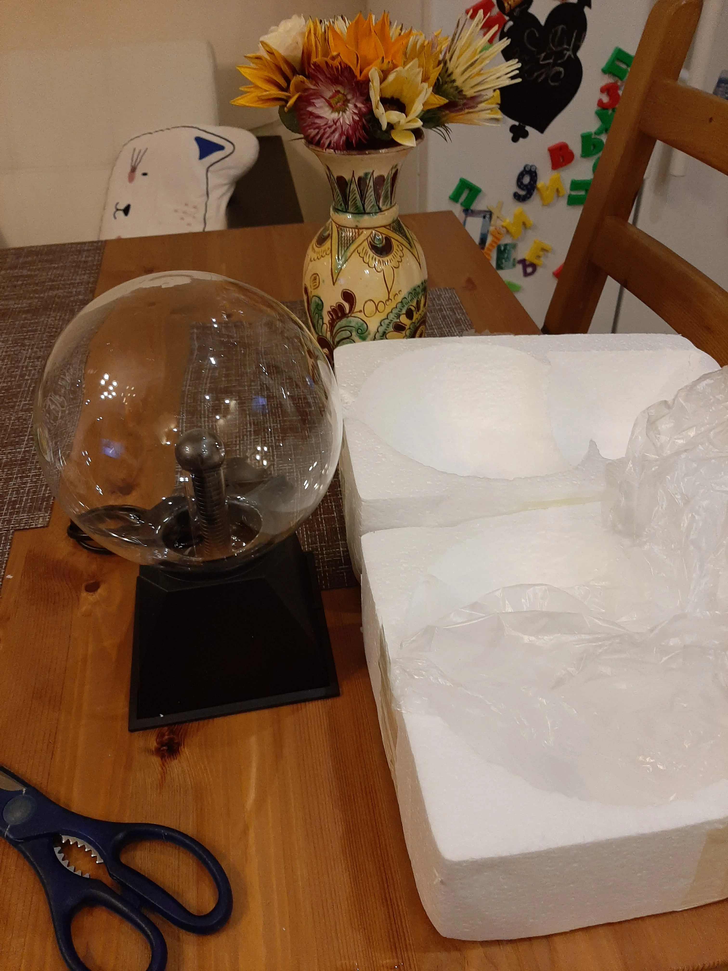 Он хорошо упаковывается между 2 пробками, чтобы шар не был поврежден. Доставка была наполовину быстрой, занимает около 1 месяца. Размеры точно совпадают