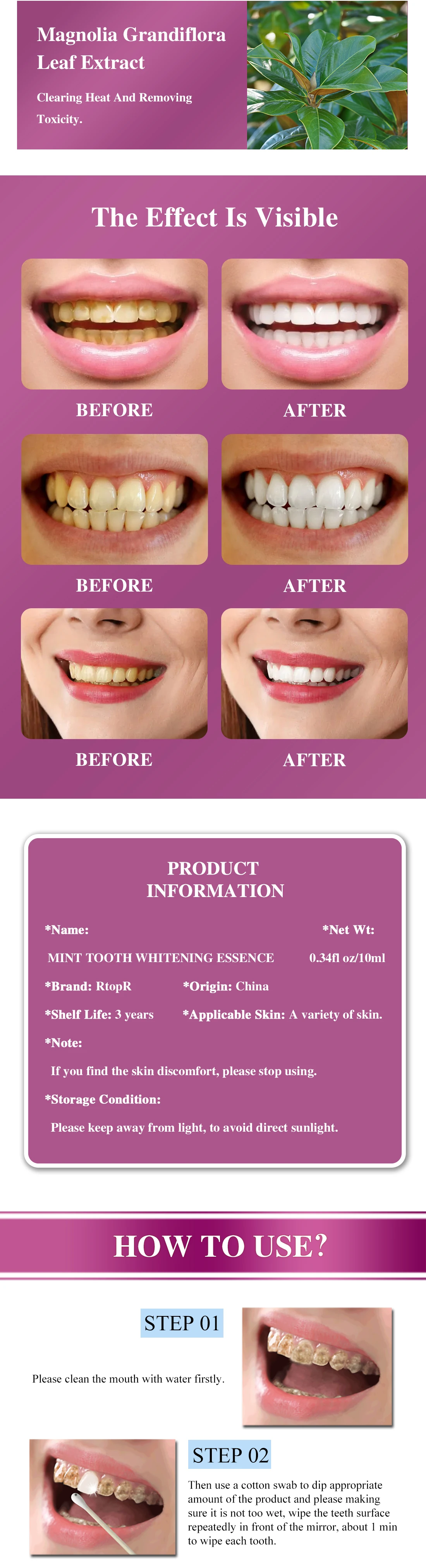 1. Сначала очистите рот водой.2. Затем Используйте ватный тампон, чтобы окунуть соответствующее количество продукта и, пожалуйста, убедитесь, что он не слишком влажный, протирайте поверхность зубов повторно перед зеркалом, около 1 мин, чтобы протереть каждый зуб.3. Пожалуйста, промойте теплой водой до тех пор, пока налет не протерется.