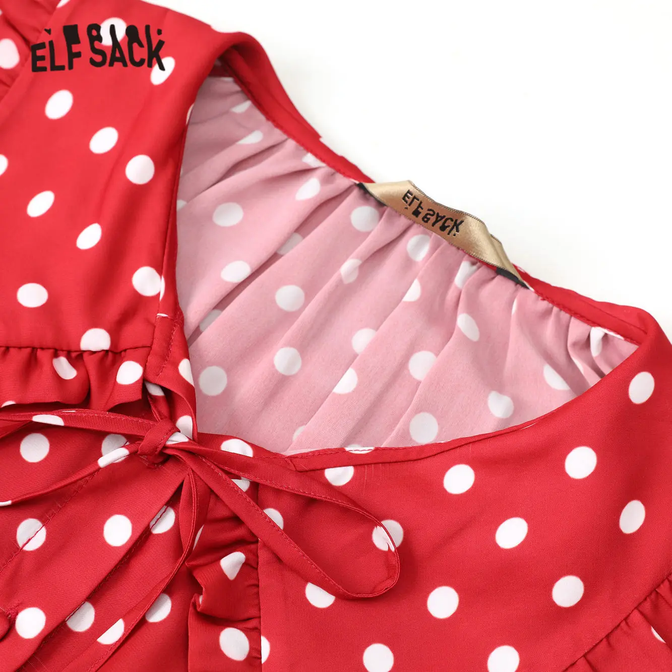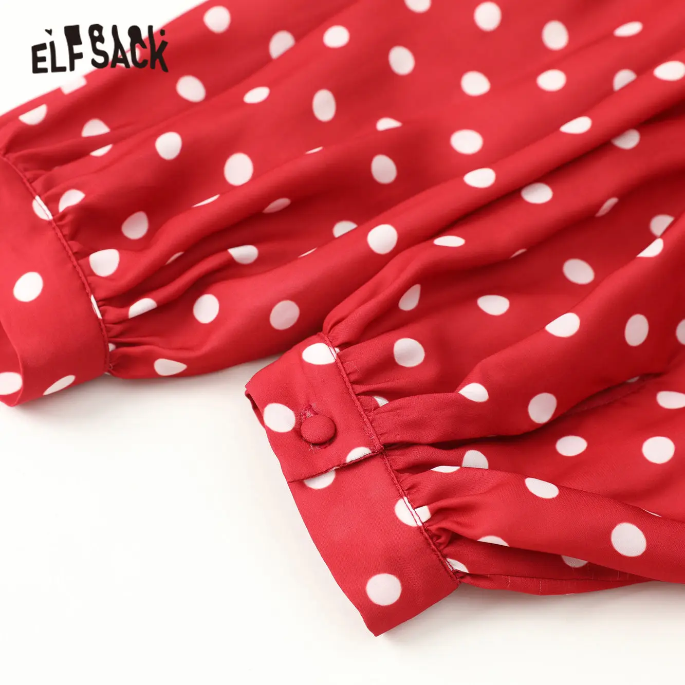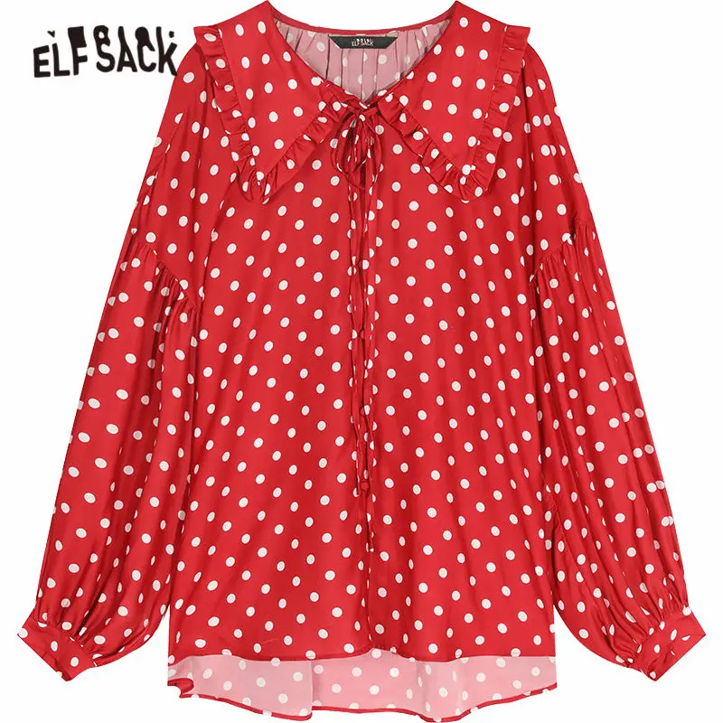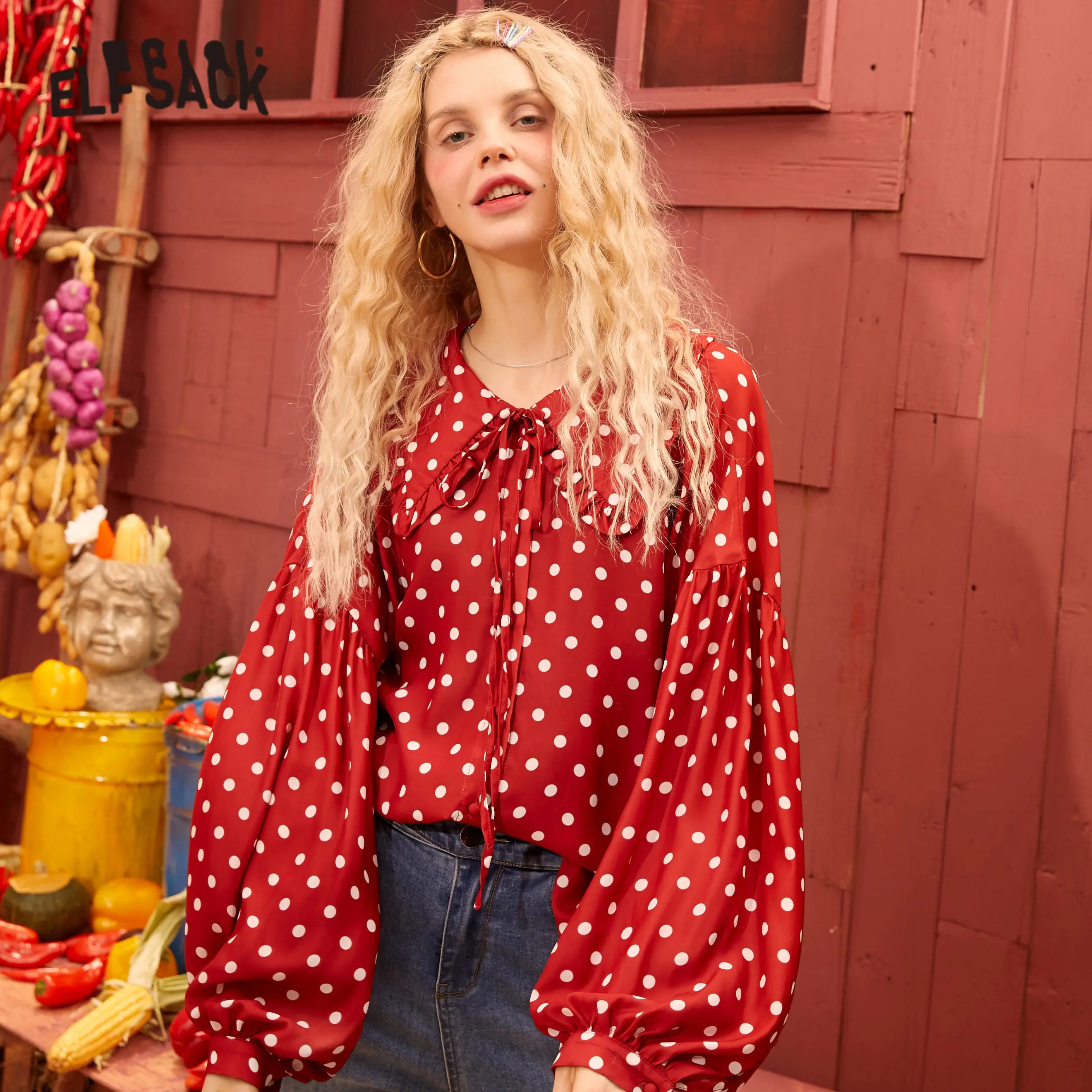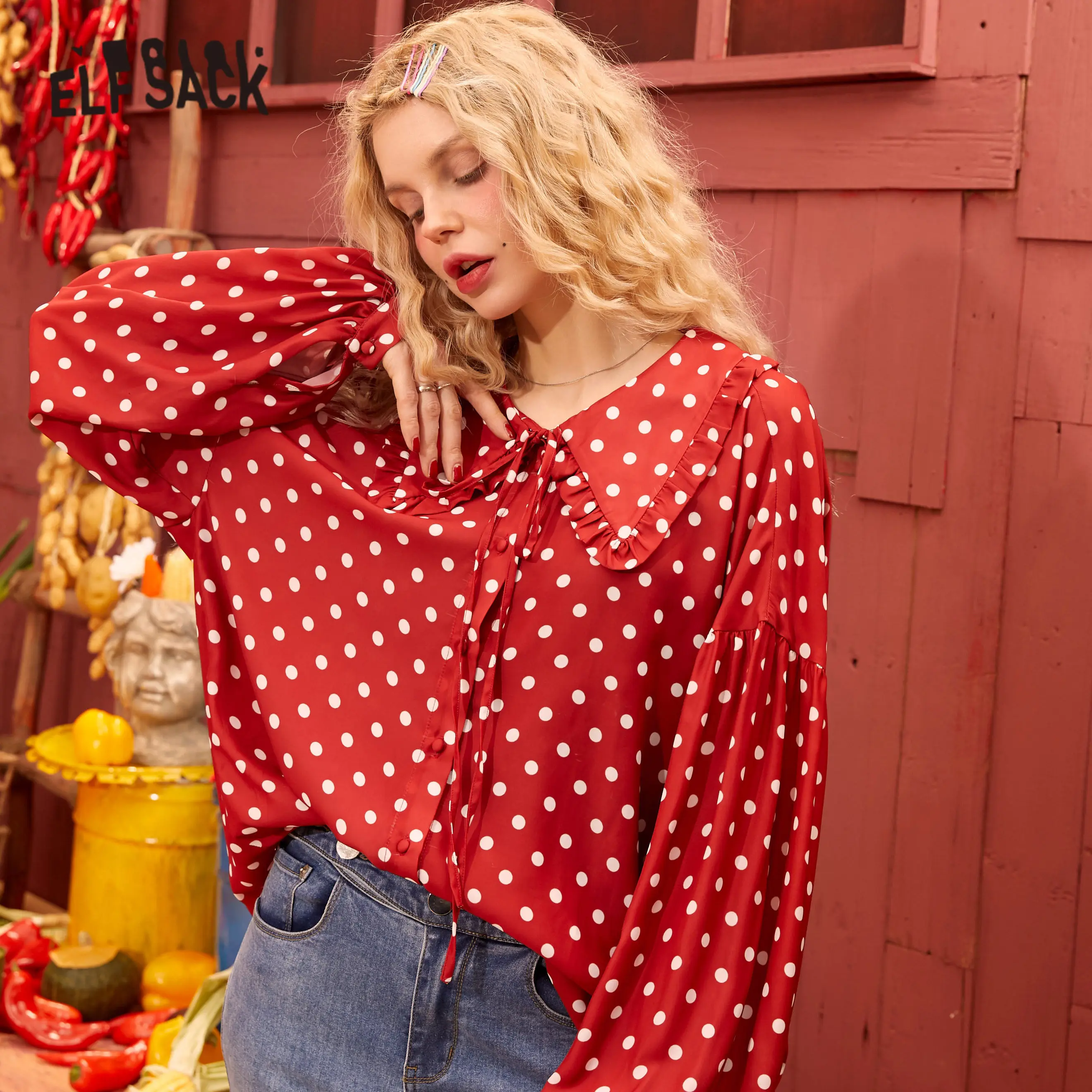Женская винтажная блузка в горошек ELFSACK, красная Повседневная Блузка в горошек с воротником Питер Пэн, с рукавами-фонариками, Корейская топы на каждый день для девушек, весна 2020