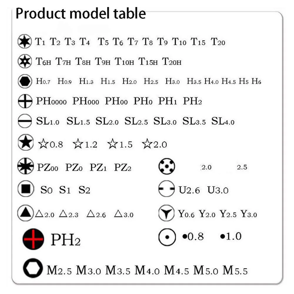 Torx: T3, T3, T4, T4, T5, T5, T6, T6, T7, T7, T8, T8, T9, T9, T10, T10, T15, T15, T20, И T20