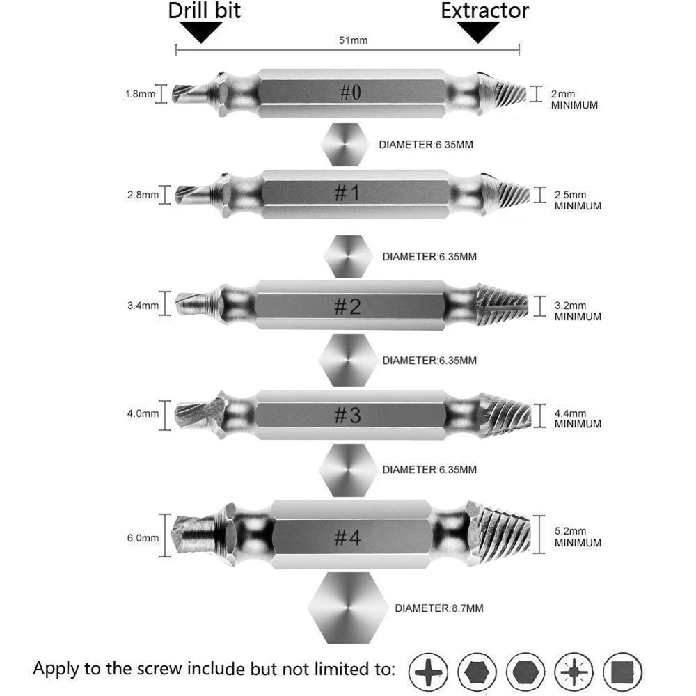 -Набор из 4 экстракторов винтов Работает с любым сверлом и любым размером винта или болтом, захватывает поврежденные крепления со скоростью и точностью, высокая эффективность, высокое качество и удобство в использовании, набор для снятия винтов изготовлен для упрощения жестких работ. Он извлечет любой винт или болт любого размера из любого материала. Легко и быстро использовать. Работает с любым сверлом, совместим с системами быстрого подключения патронов. Отлично подходит для всех-отлично подходит для вас!