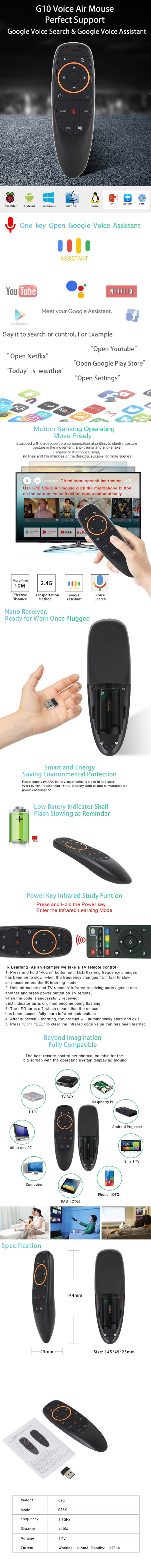 Пульт дистанционного управления для Android TV Box, G10, 2.4 Гц, курсор Air Mouse, беспроводной, голосовой помощник Google, микрофон, ИК