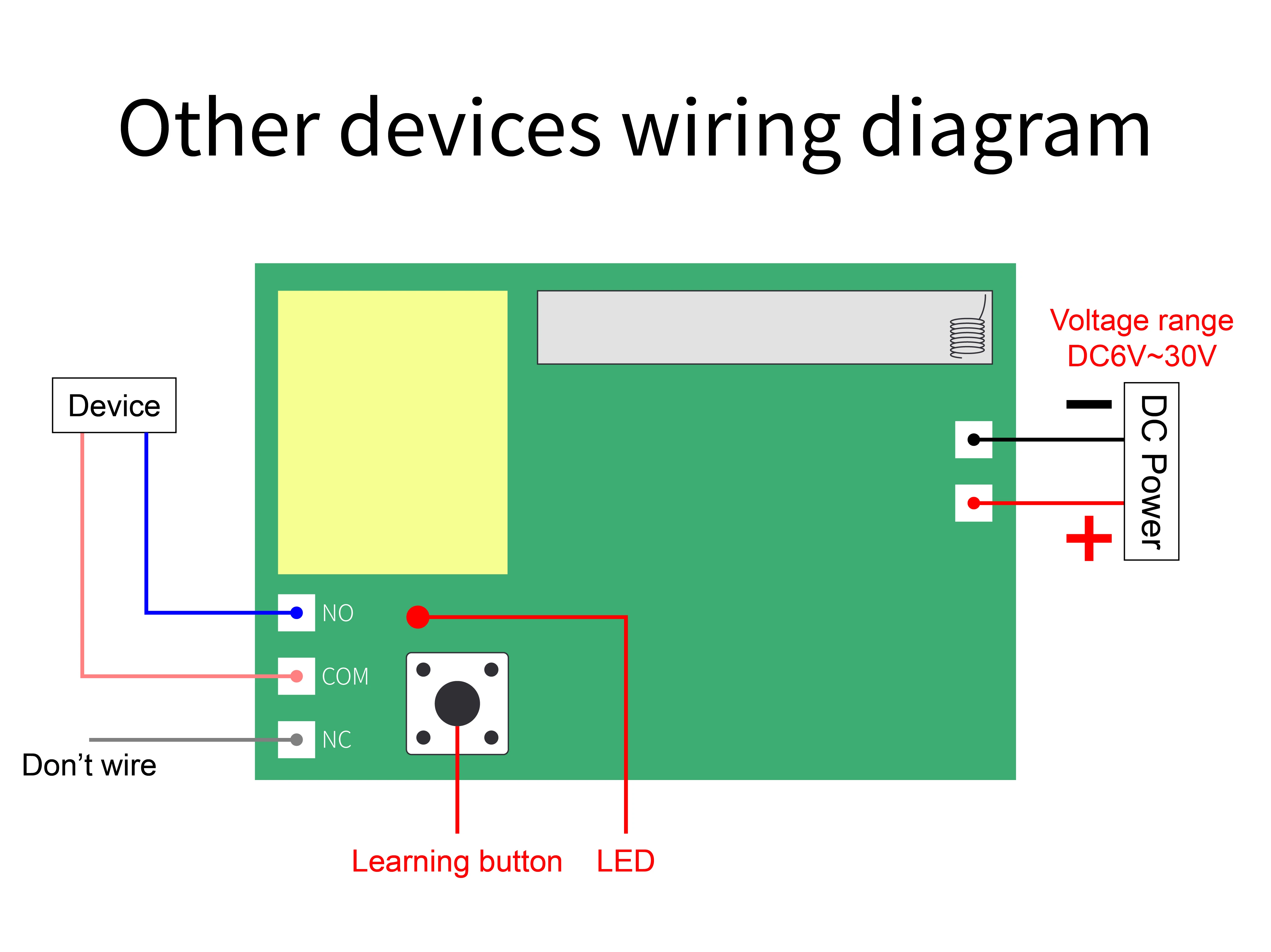 Нажмите кнопку обучения на приемнике один раз, он приходит в мгновенный режим настройки. Подождите немного, светодиод будет выключен, он войдет в состояние обучения. Нажмите кнопку дистанционного управления, светодиодный индикатор на плате приемника будет мигать, а затем выключается. Через 3 секунды светодиодный индикатор будет включаться снова и успешно учится.