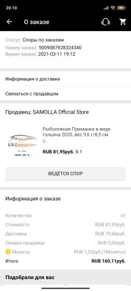 продавец втюхал мне совершено другое, открыл спор прод пишет что всë заебись это он и есть, попробовал на воде так он как припадочный крутится и все мои танцы вокруг него не помогли, Али деньги возвращать не хотят только за сам воблер а то что доставка им пох, вобщем кто хочет купить брелок за 200р то смело все сюда