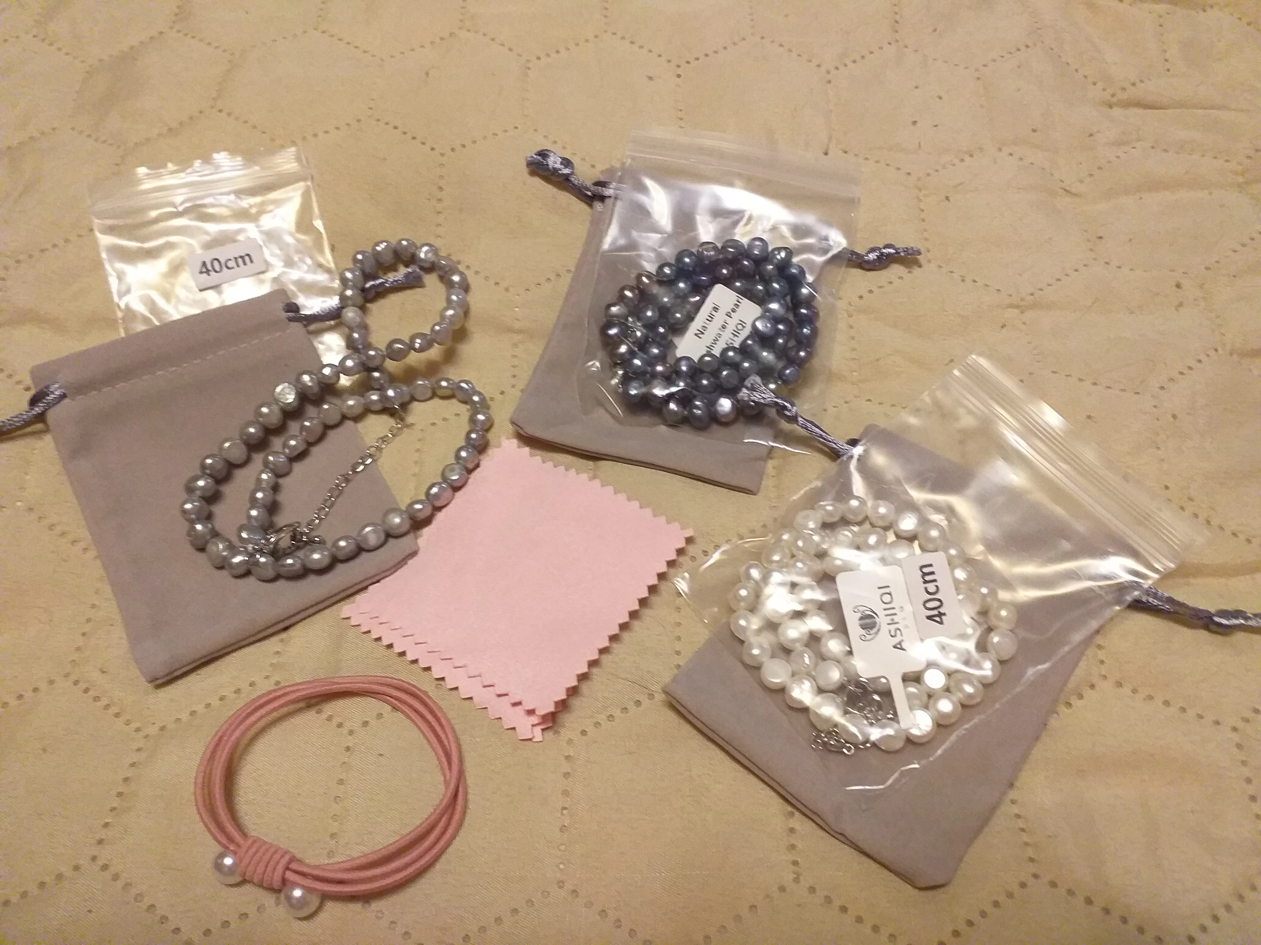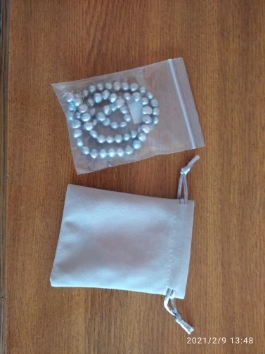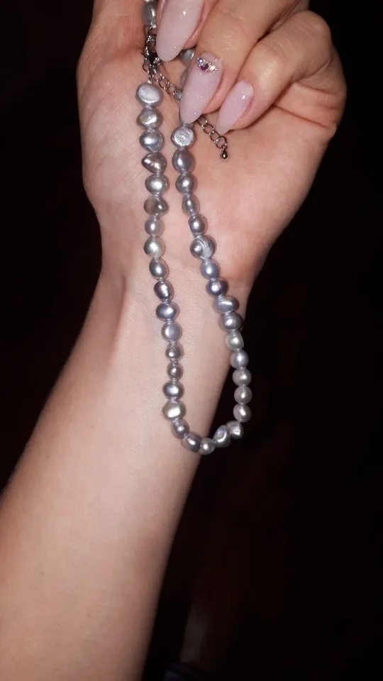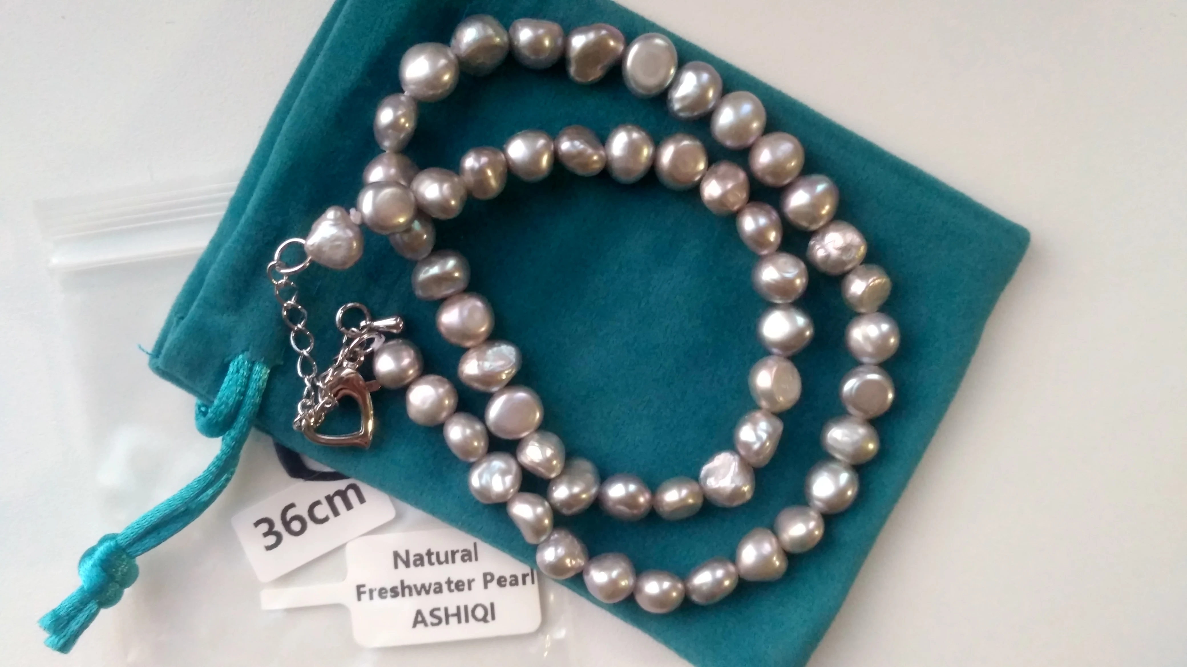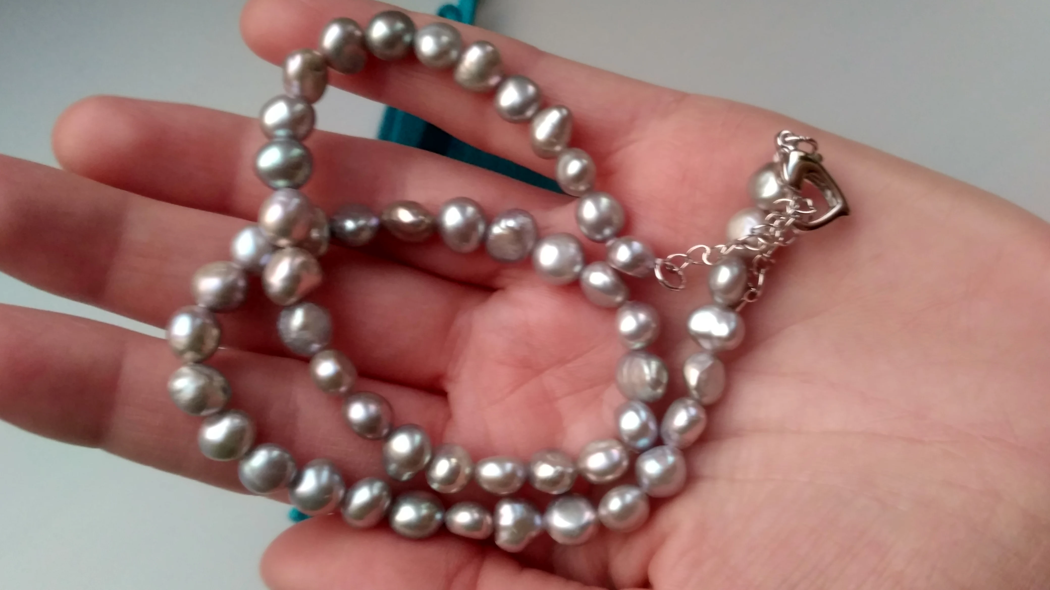 Чокер пришёл за месяц. Красивый мешочек с салфеточкой. Жемчуг на зубах скрипит, на ощупь холодный, не легкий, значит можно смело сказать, что он настоящий, хотя выращен в пресной воде, как указано на этикетке, а значит все же в искусственной среде и является не натуральным. Длина ожерелья размера 36см - 36 см вместе с застежкой в форме сердечка, регулировать длину можно с помощью добавочных звеньев, длина которых составляет 4,5 см. Так что 36 смело превращается в 40см. Застежка на вид крепкая, немного неудобно застегивать сначала, но потом получается быстро. Цвет не чисто серый как на фото, при холодном освещении переливается перламутрово-розоватым оттенком. Жемчужинки разной формы, диаметром ~5-6мм, одеты на нитку, по-моему синтетическую. В моём чокере есть небольшой косяк, в одной из жемчужин отверстие для нитки сделано не по центру, а как-то сбоку, и из-за того, что расстояние между жемчужинами практически отсутствует, ожерелье в этом месте топорщится. Можно конечно переделать, но я