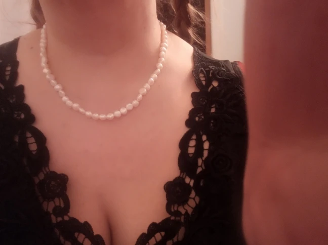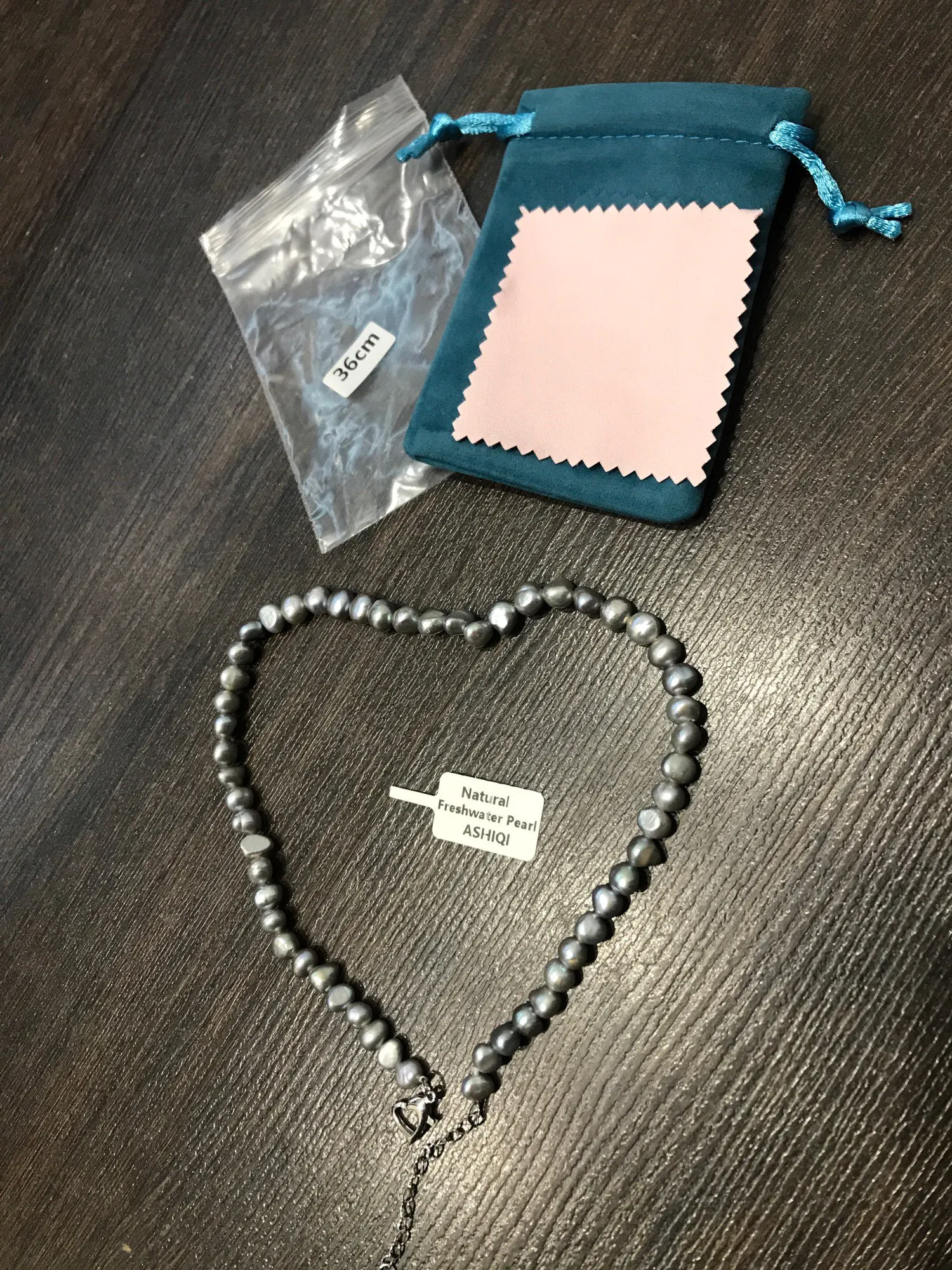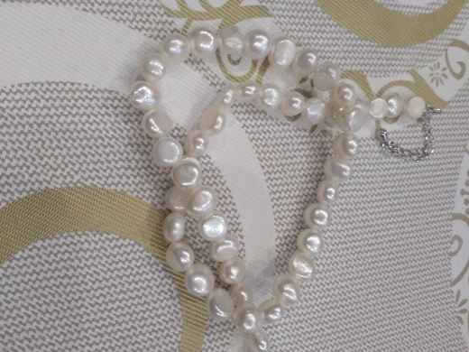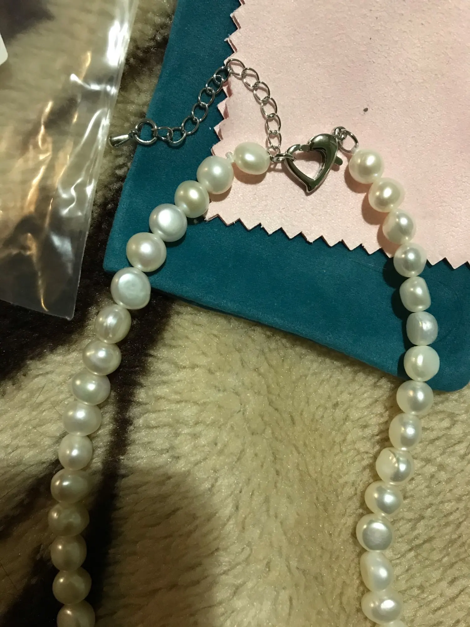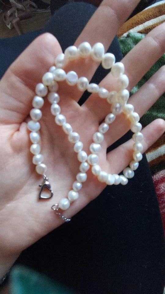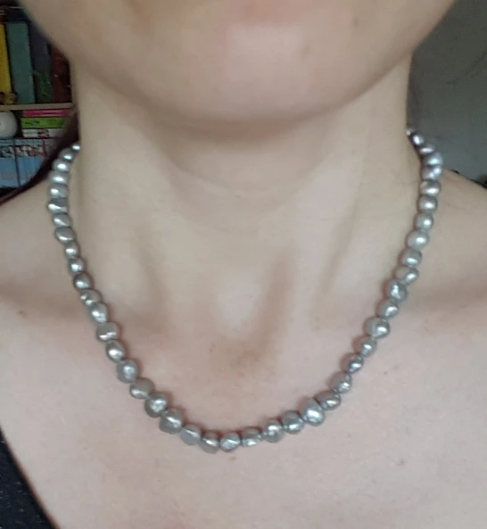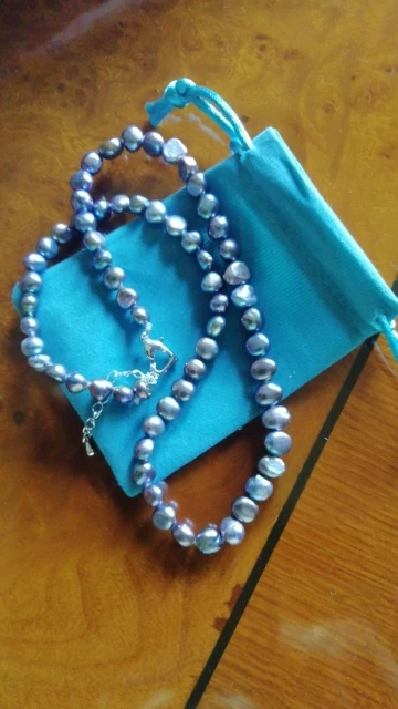 Чокер пришёл за месяц. Красивый мешочек с салфеточкой. Жемчуг на зубах скрипит, на ощупь холодный, не легкий, значит можно смело сказать, что он настоящий, хотя выращен в пресной воде, как указано на этикетке, а значит все же в искусственной среде и является не натуральным. Длина ожерелья размера 36см - 36 см вместе с застежкой в форме сердечка, регулировать длину можно с помощью добавочных звеньев, длина которых составляет 4,5 см. Так что 36 смело превращается в 40см. Застежка на вид крепкая, немного неудобно застегивать сначала, но потом получается быстро. Цвет не чисто серый как на фото, при холодном освещении переливается перламутрово-розоватым оттенком. Жемчужинки разной формы, диаметром ~5-6мм, одеты на нитку, по-моему синтетическую. В моём чокере есть небольшой косяк, в одной из жемчужин отверстие для нитки сделано не по центру, а как-то сбоку, и из-за того, что расстояние между жемчужинами практически отсутствует, ожерелье в этом месте топорщится. Можно конечно переделать, но я